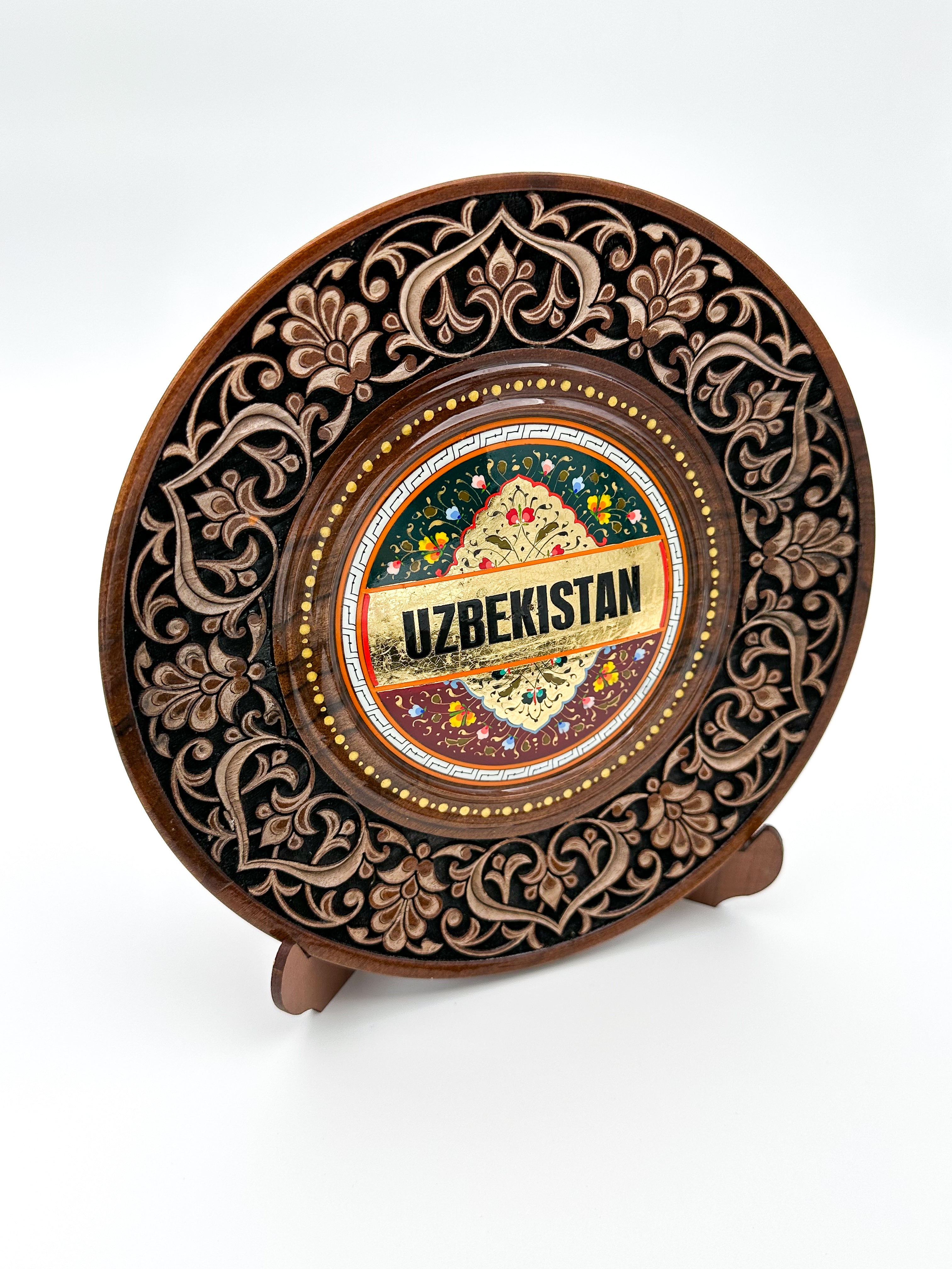 Buy nowIntroducing a handcrafted wooden plate from Uzbekistan, featuring intricate floral carvings and vibrant patterns with "Uzbekistan" at its center. Perfect for display or wall decor, it adds a touch of cultural elegance and craftsmanship.