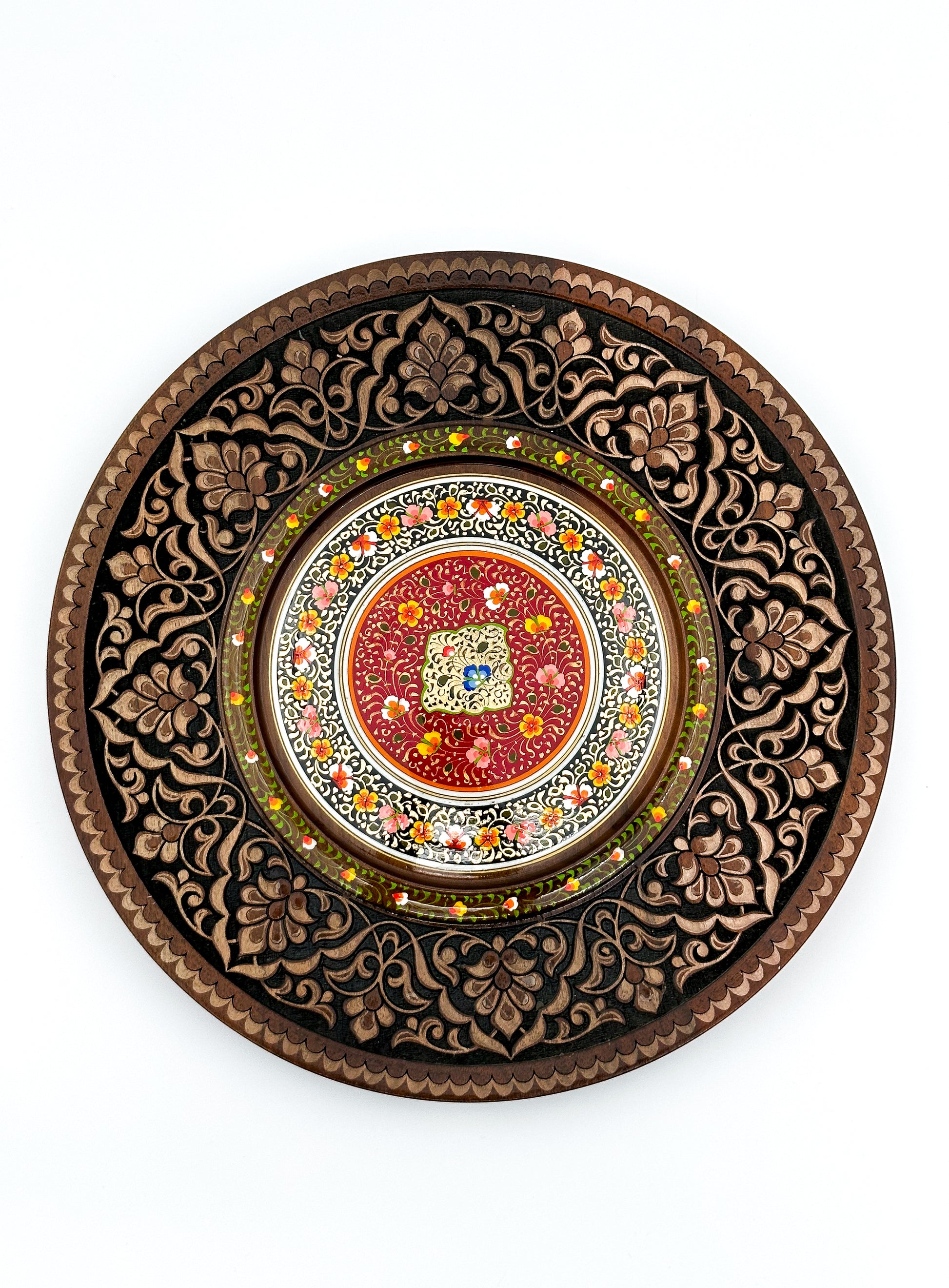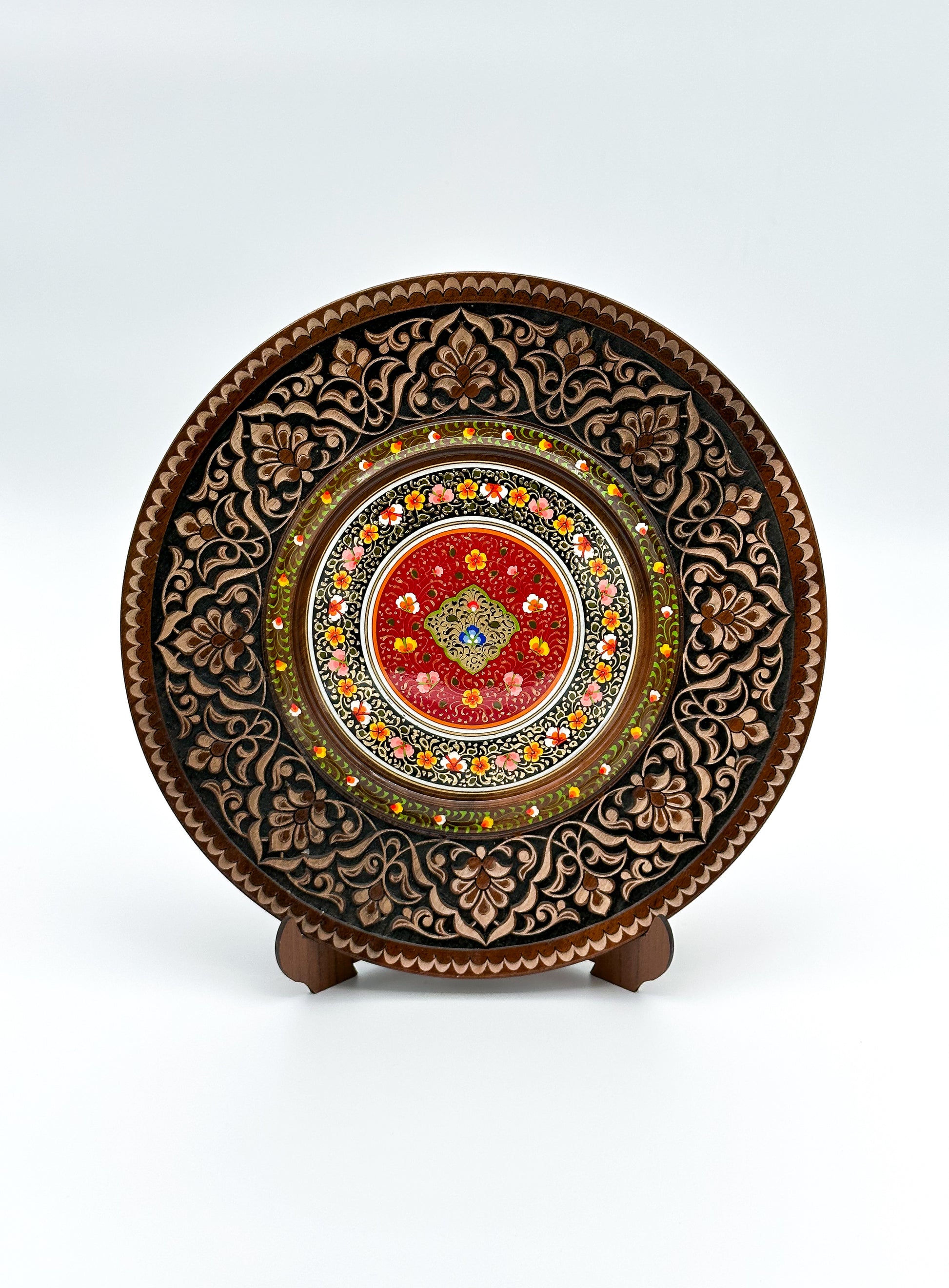 Presenting the Golden Heritage Mandala Plate, a breathtaking embodiment of traditional Uzbek craftsmanship. This exquisite plate features hand-carved floral patterns surrounding a radiant mandala design, delicately accented with intricate gold details and vibrant hues. The harmonious blend of colors and craftsmanship celebrates the rich cultural heritage of Uzbekistan, making this plate not just a decorative piece, but a symbol of elegance and timeless artistry. Perfect for adorning your home or as a thoughtful gift, the Golden Heritage Mandala Plate brings beauty and tradition to any space.