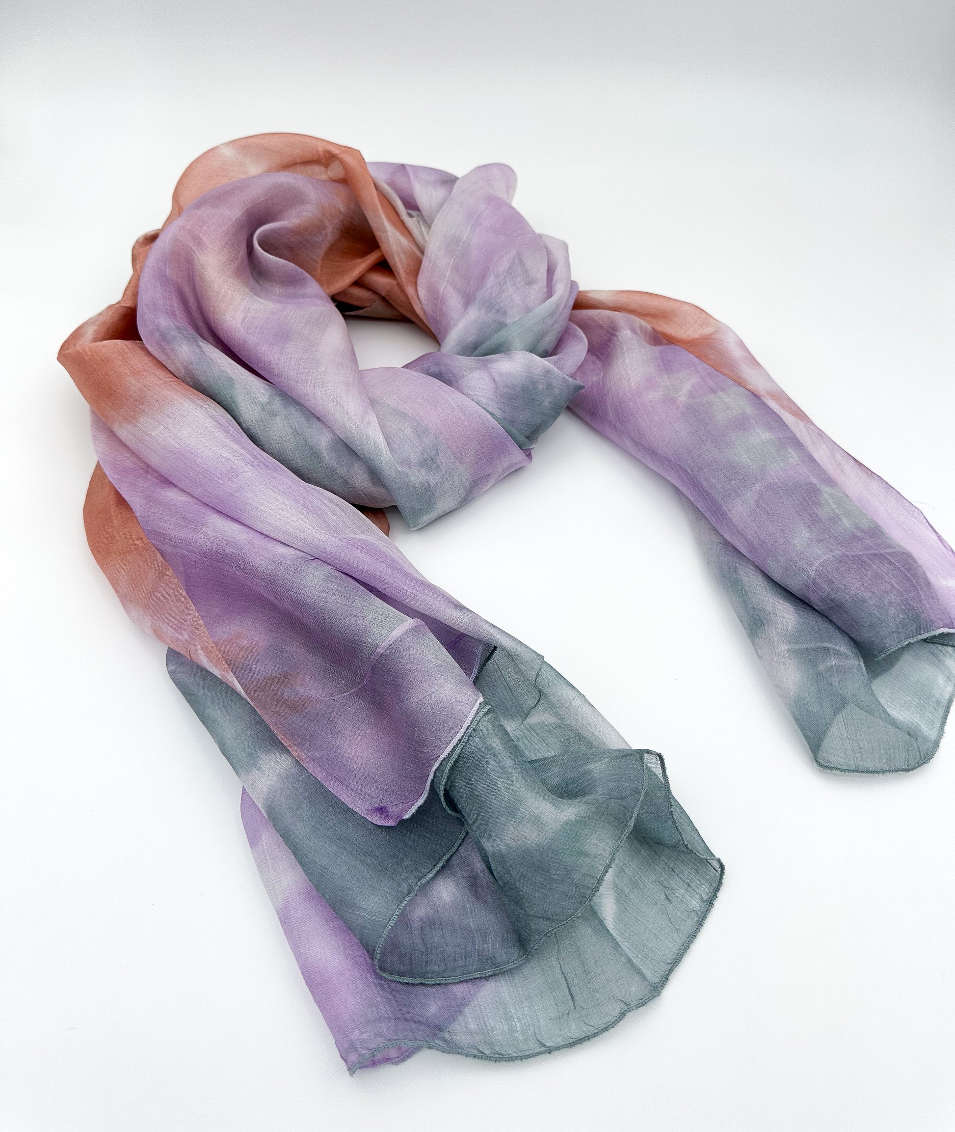 Introducing the Dusky Horizon Silk Scarf—a captivating blend of soft, flowing colors reminiscent of a serene evening sky. This luxurious scarf combines gentle hues of lavender, peach, and slate, creating a harmonious and elegant gradient that evokes tranquility and sophistication. Perfectly lightweight and crafted from the finest silk, it drapes beautifully, adding an ethereal touch to any outfit. Whether you're dressing up for a special occasion or adding a chic accessory to your everyday look, the Dusky Horizon Silk Scarf will wrap you in effortless elegance and comfort.