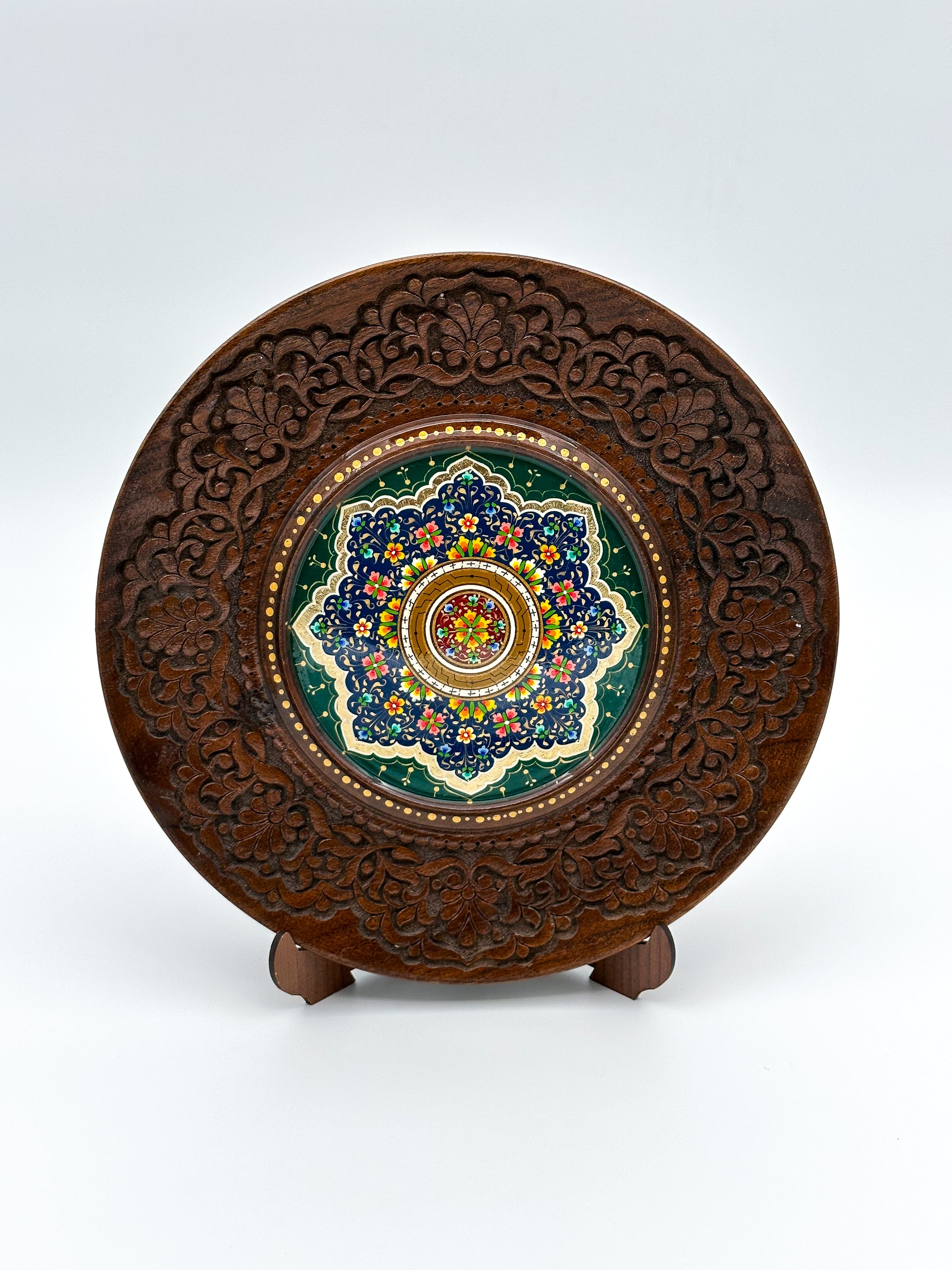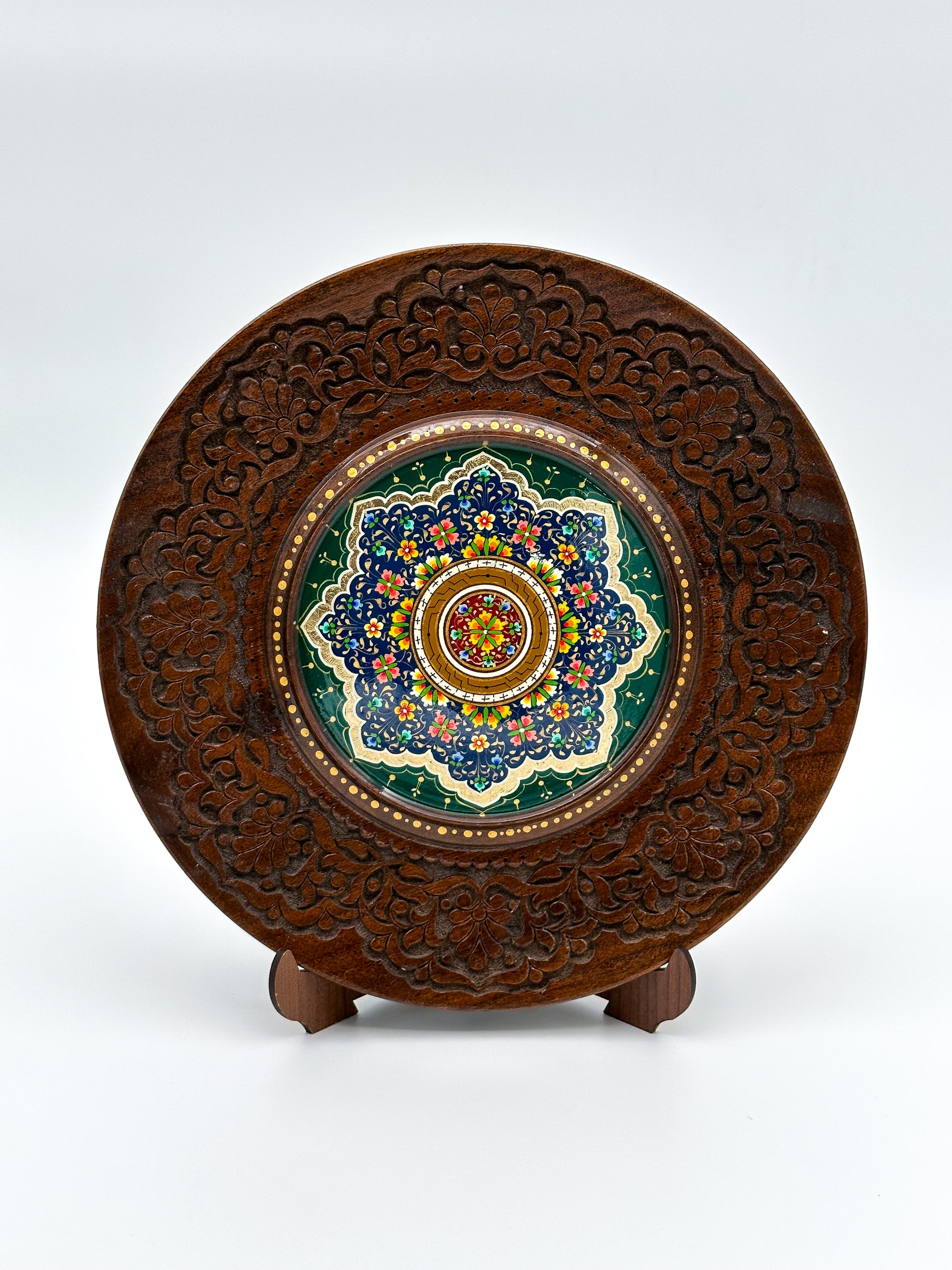 Introducing the Emerald Blossom Wall Plate – a stunning fusion of intricate craftsmanship and vibrant design. This decorative piece features a hand-painted floral medallion, surrounded by detailed engravings on a rich, wooden base. The vibrant greens and blues create a vivid focal point, perfect for adding a touch of elegance to your home or office. Whether displayed on a wall or showcased on its included stand, this unique plate is a celebration of traditional artistry, making it an ideal gift or collector’s item for those who appreciate cultural craftsmanship. Elevate your space with timeless beauty!