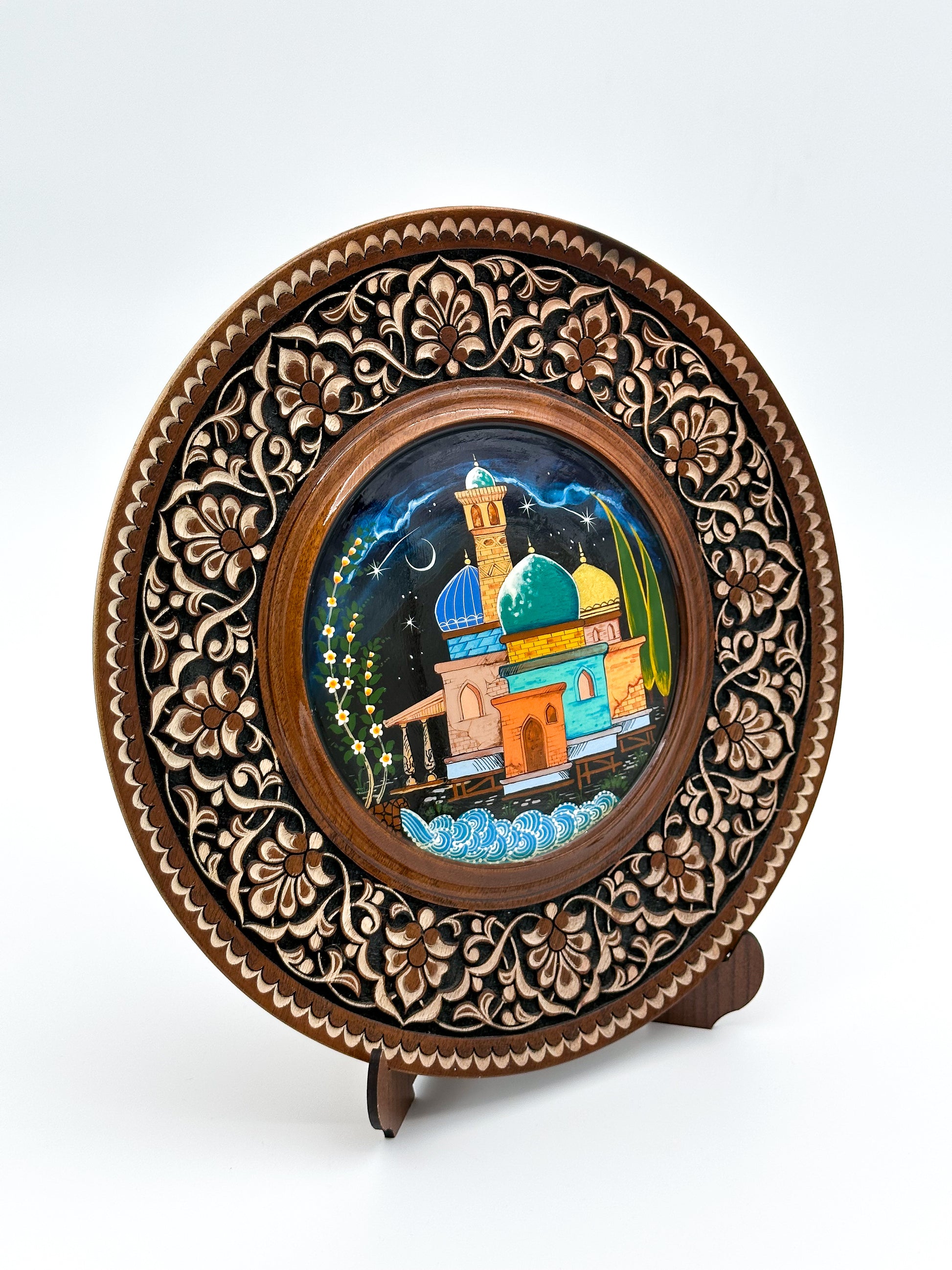 Introducing the Moonlit Madrasa Decorative Plate, a breathtaking work of art that captures the enchanting beauty of traditional Uzbek architecture under a starry night sky. Handcrafted from premium wood, this intricately carved plate features a vibrant depiction of a madrasa, highlighted by glowing domes and a serene night scene. Ideal for displaying in your home or office, it comes with a matching wooden stand, making it a perfect piece to showcase on a shelf or mantel. Add a touch of Uzbekistan’s rich cultural heritage to your decor with this one-of-a-kind masterpiece.