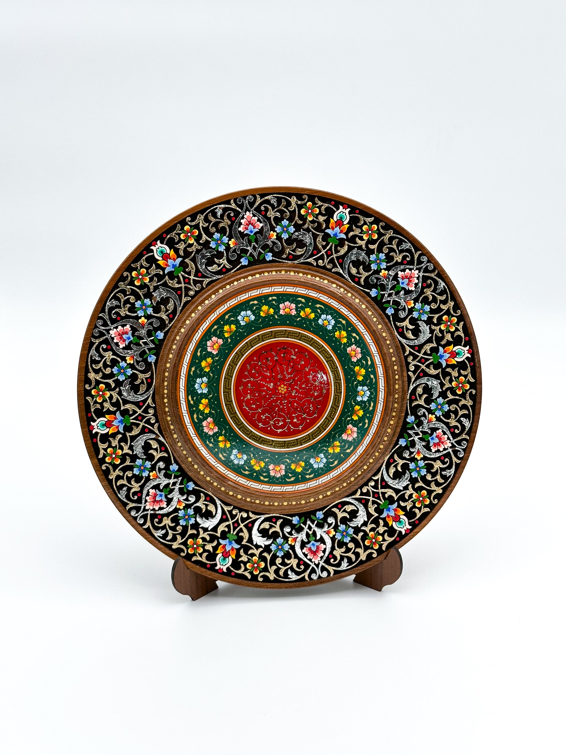 Introducing the "Ornament of Heritage", a stunning decorative plate that beautifully captures the essence of tradition and artistry. Meticulously handcrafted, this masterpiece is adorned with intricate floral patterns in vivid reds, greens, and golden hues. Perfect for adding a touch of cultural elegance to any space, this plate is more than just a decorative piece—it's a celebration of heritage, designed to inspire and captivate. Elevate your home décor with the timeless beauty of this handcrafted treasure, a true symbol of artistry and tradition.