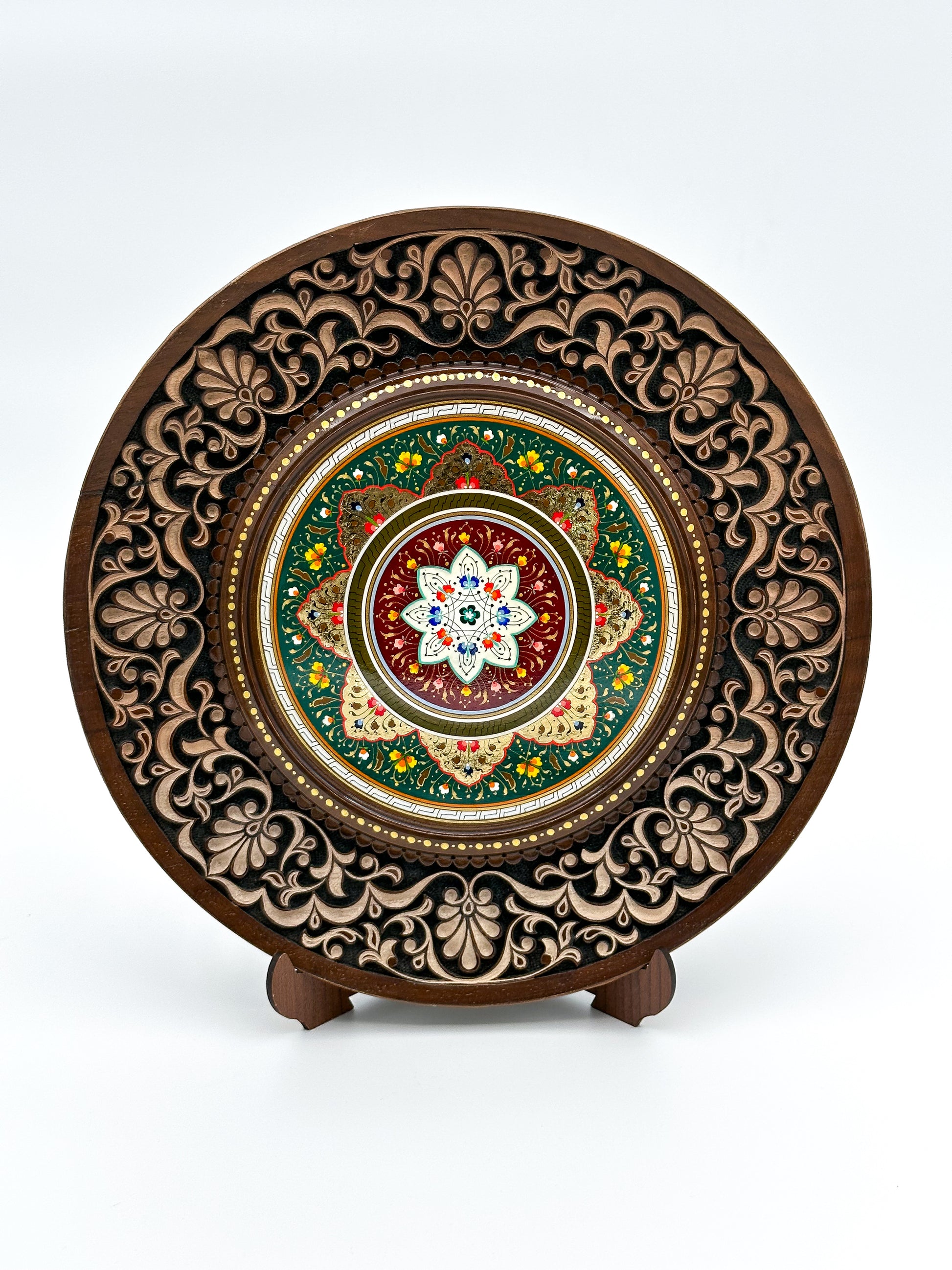 Elevate your home décor with the "Ornate Floral Harmony Wall Plate." This handcrafted wooden plate is a masterpiece of intricate design, featuring delicate floral motifs meticulously carved and painted in vibrant colors. At its heart, a captivating medallion of floral patterns shines with rich green, red, and gold accents, embodying the essence of traditional craftsmanship.