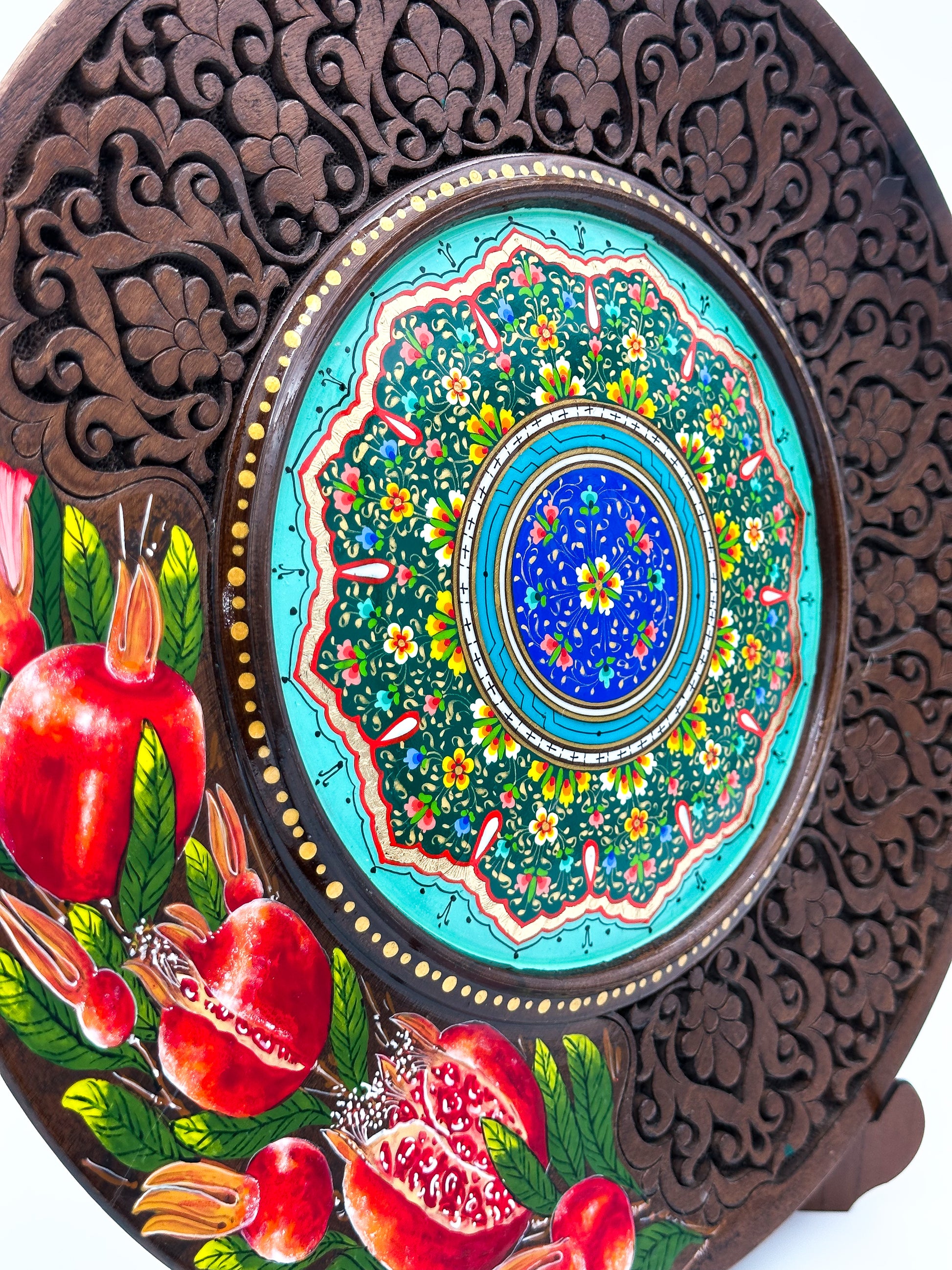 Introducing the "Pomegranate Blossom Decorative Wall Plate," a stunning fusion of traditional craftsmanship and artistic design. Handcrafted from high-quality wood, this elegant plate showcases vibrant hand-painted pomegranate motifs alongside an intricate floral mandala, symbolizing abundance and vitality. Its rich colors and delicate carvings make it the perfect statement piece for your home, bringing a touch of Uzbekistan's cultural heritage into any room. Display it on the wall or place it on its stand—either way, it's a timeless work of art that celebrates beauty and tradition.