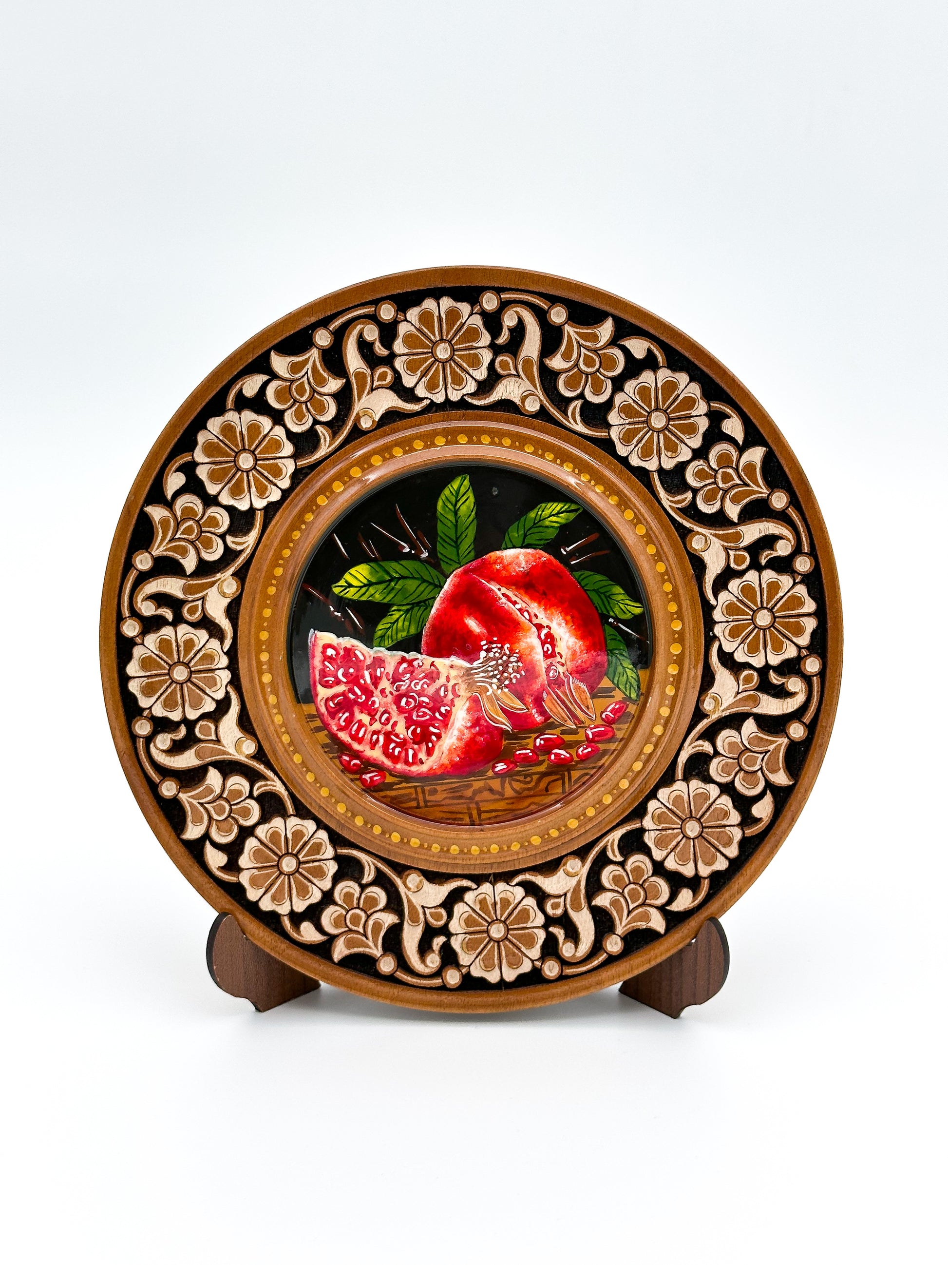 Introducing the Pomegranate Delight Wall Plate—a stunning fusion of craftsmanship and tradition. Hand-painted with vivid colors, this decorative plate captures the essence of nature with a striking pomegranate design framed by intricate floral carvings. Perfect for adding a touch of elegance to your home, this unique piece symbolizes abundance and beauty. Display it proudly on your wall or showcase it on its elegant wooden stand to enhance any room with a timeless artistic flair. Ideal as a gift or a cherished keepsake, this wall plate is sure to impress.