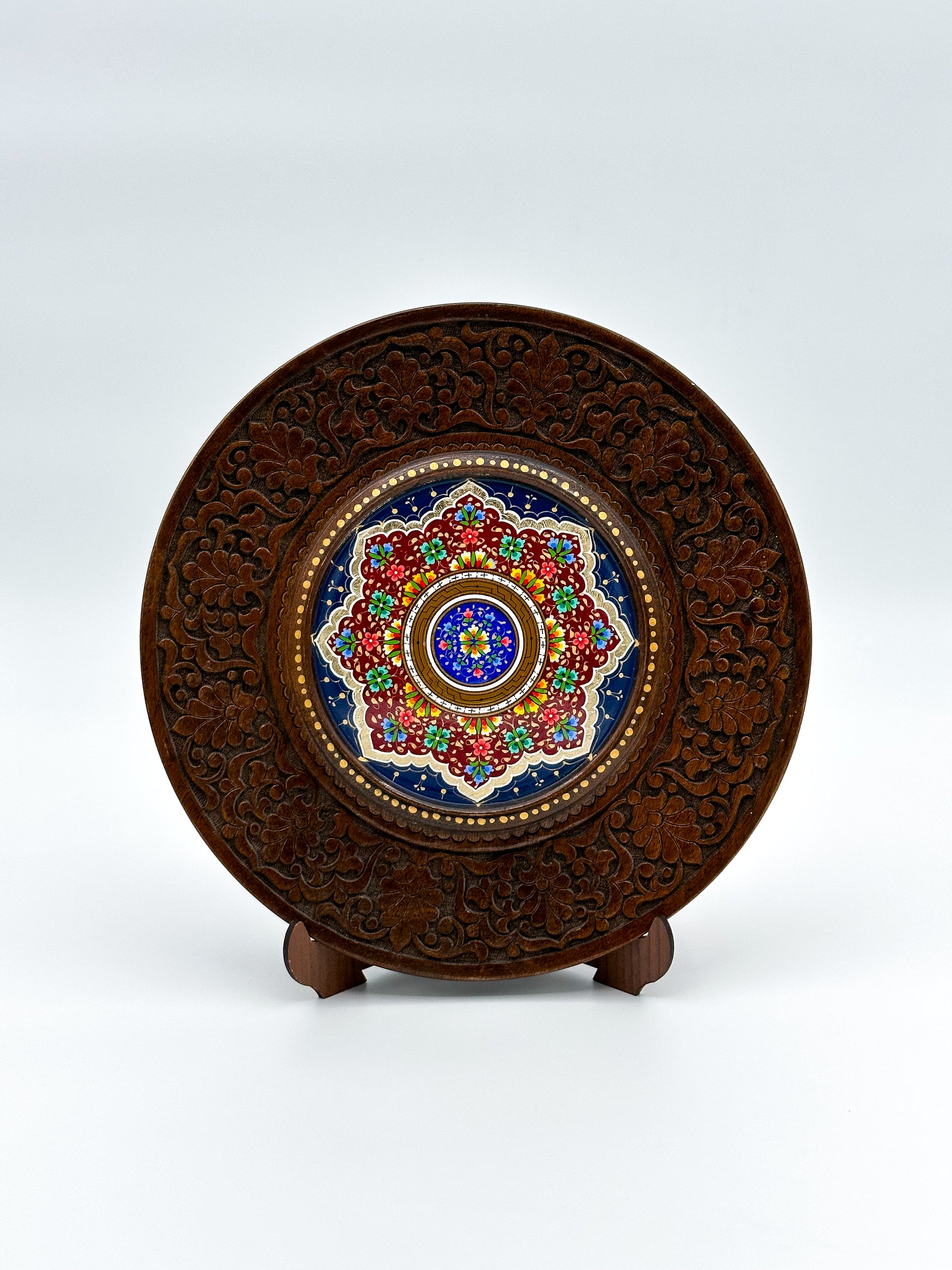 Introducing the Royal Blossom Mandala Plate—an exquisite fusion of traditional craftsmanship and vibrant artistry. This handcrafted wall plate features a detailed mandala design in stunning shades of blue, red, and gold, framed by intricate floral carvings. Made from premium wood, its elegant pattern is meticulously hand-painted, symbolizing the beauty and harmony of nature. Perfect as a decorative centerpiece or a unique gift, this timeless piece will add a touch of elegance and cultural richness to any space. Display it on your wall or table to embrace the spirit of artisan luxury.
