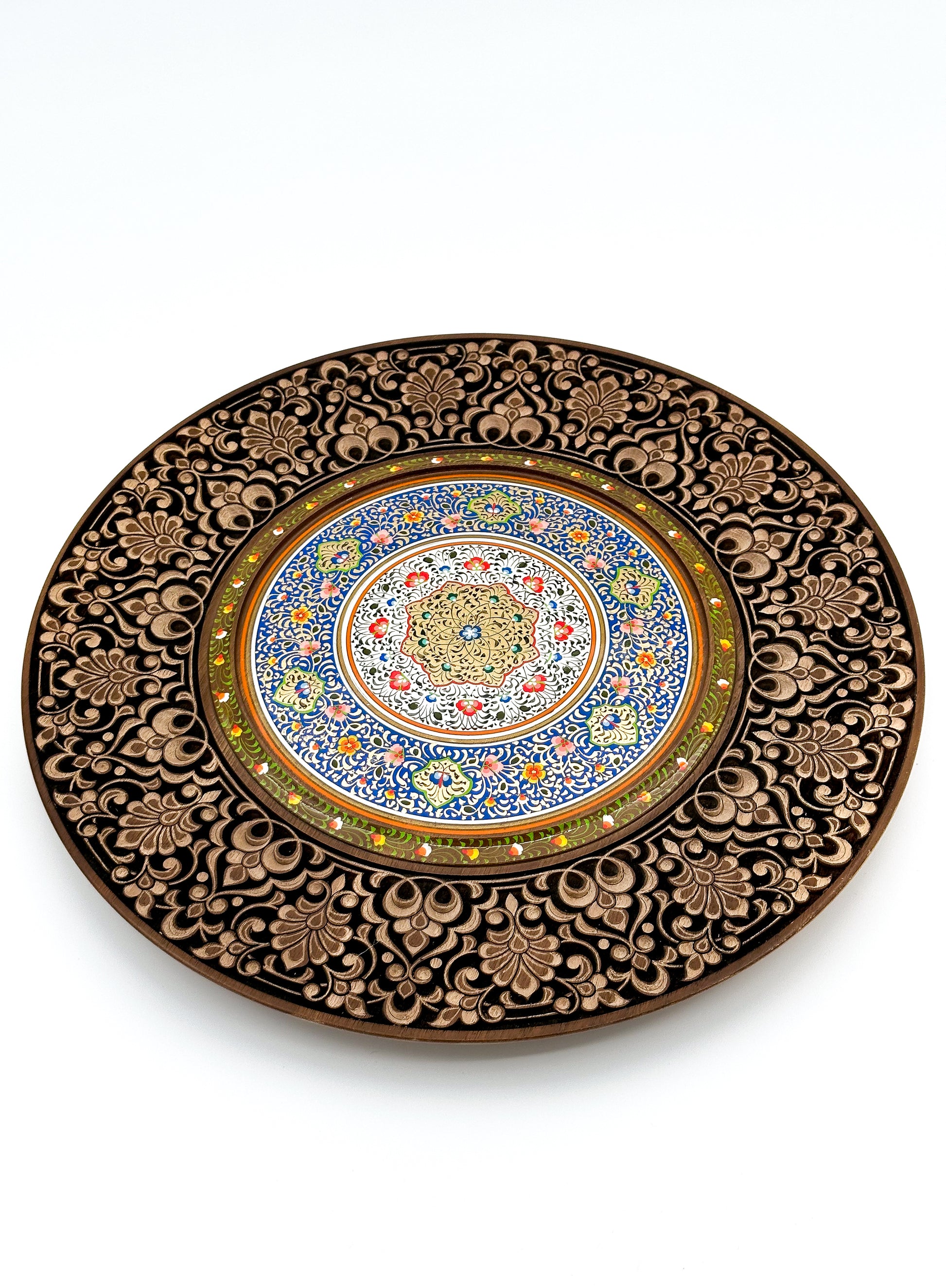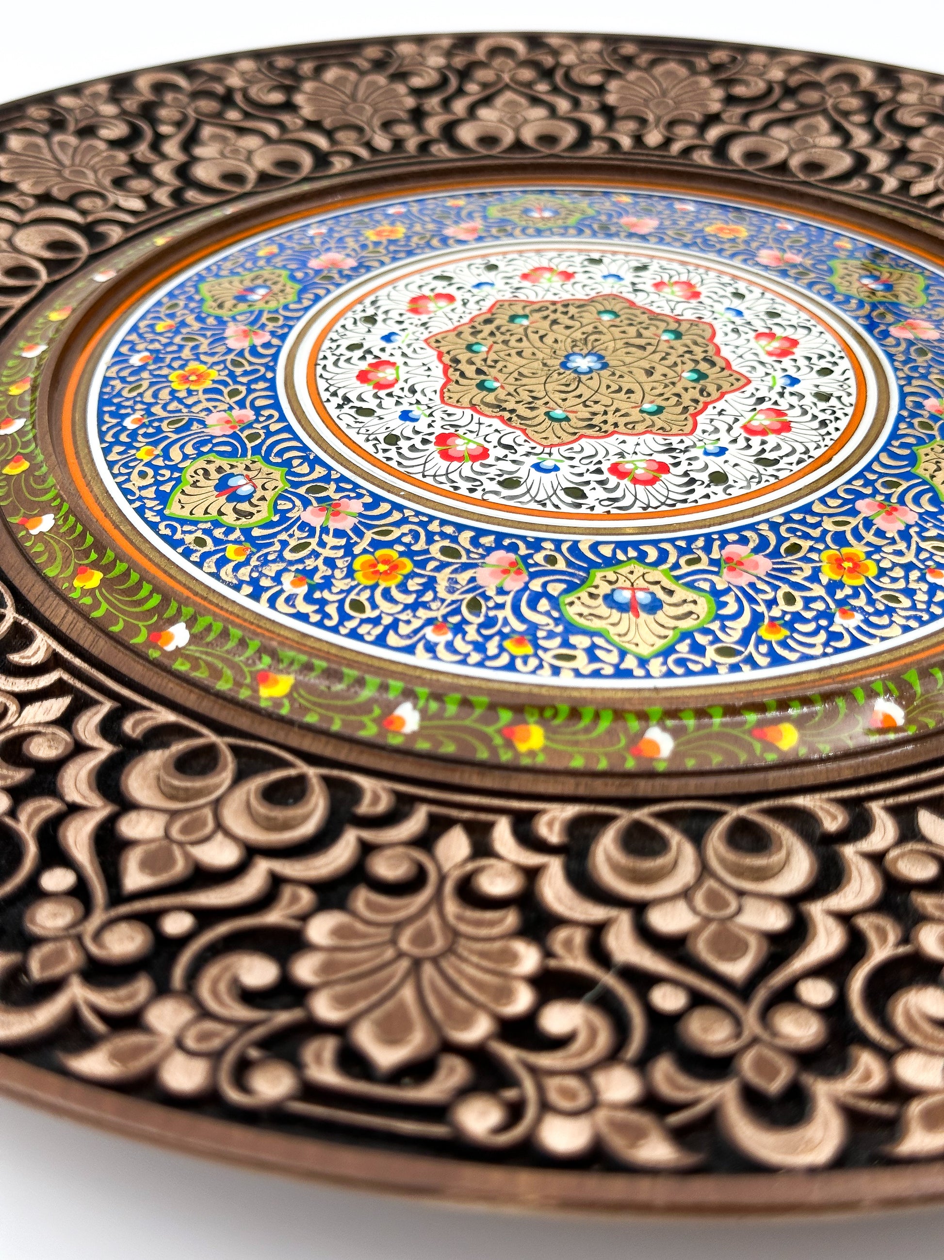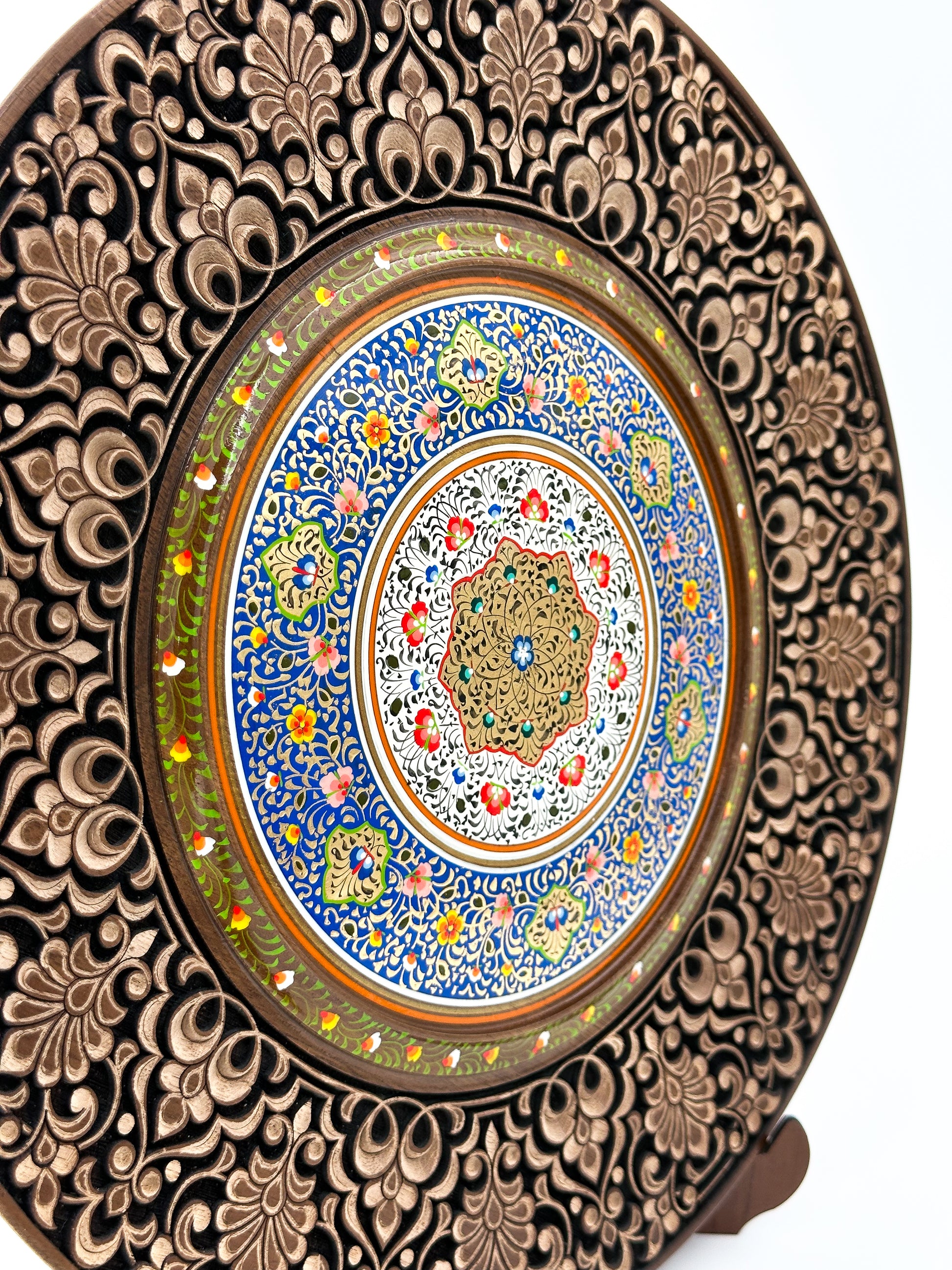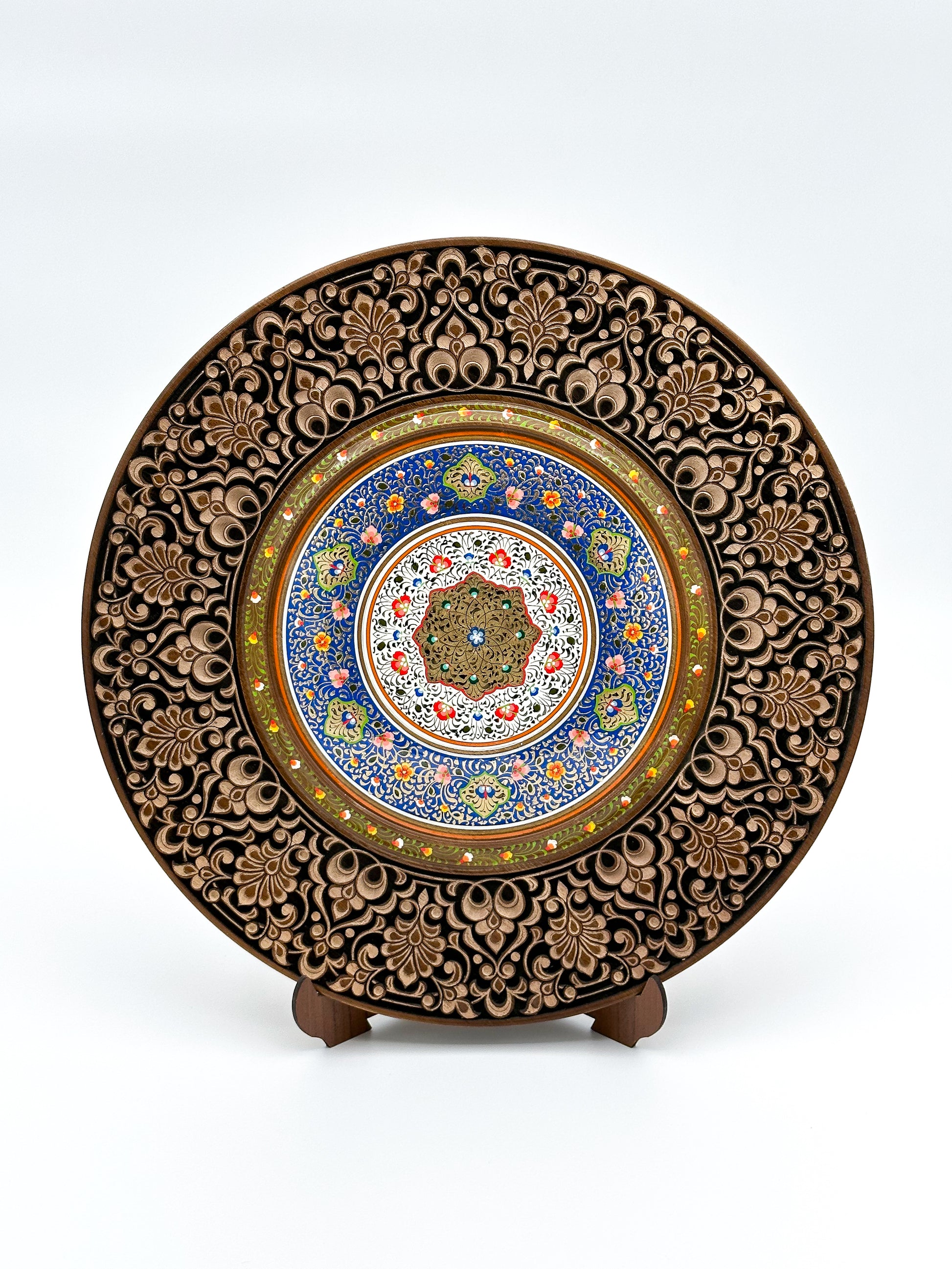 Introducing the Sapphire Garden Decorative Plate, a masterpiece of traditional craftsmanship and exquisite detail. This hand-carved wooden plate showcases an intricate floral pattern set against a rich sapphire blue, capturing the beauty of nature and the elegance of Uzbek artistry. Each delicate motif is meticulously painted to evoke a sense of harmony and balance, making this decorative piece perfect for enhancing the aesthetic of any room. Whether displayed on a mantel, shelf, or wall, the Sapphire Garden Plate is a timeless reminder of the beauty found in handcrafted art. Perfect as a gift or centerpiece, this plate will elevate any home with its rich cultural heritage and stunning design.