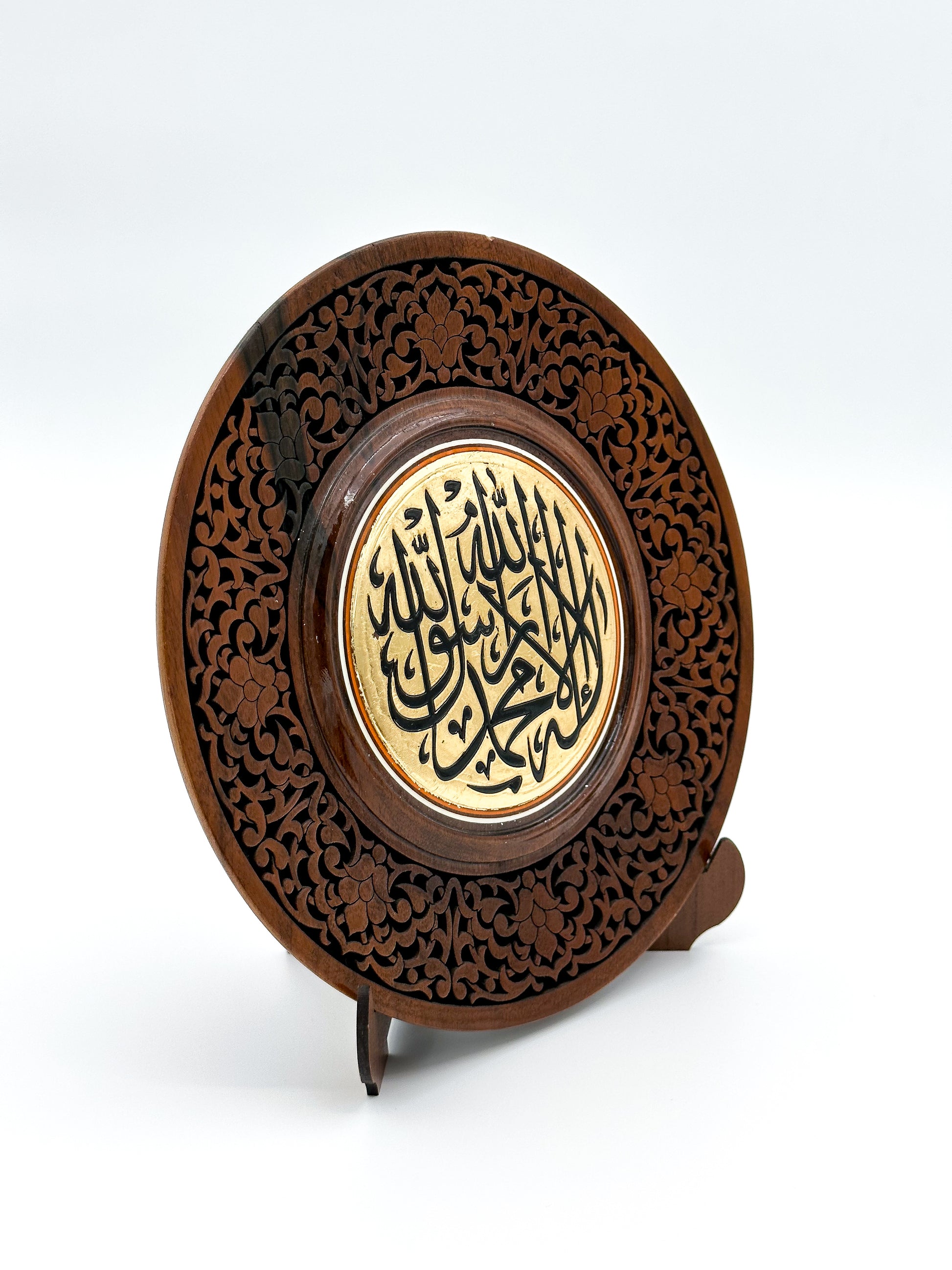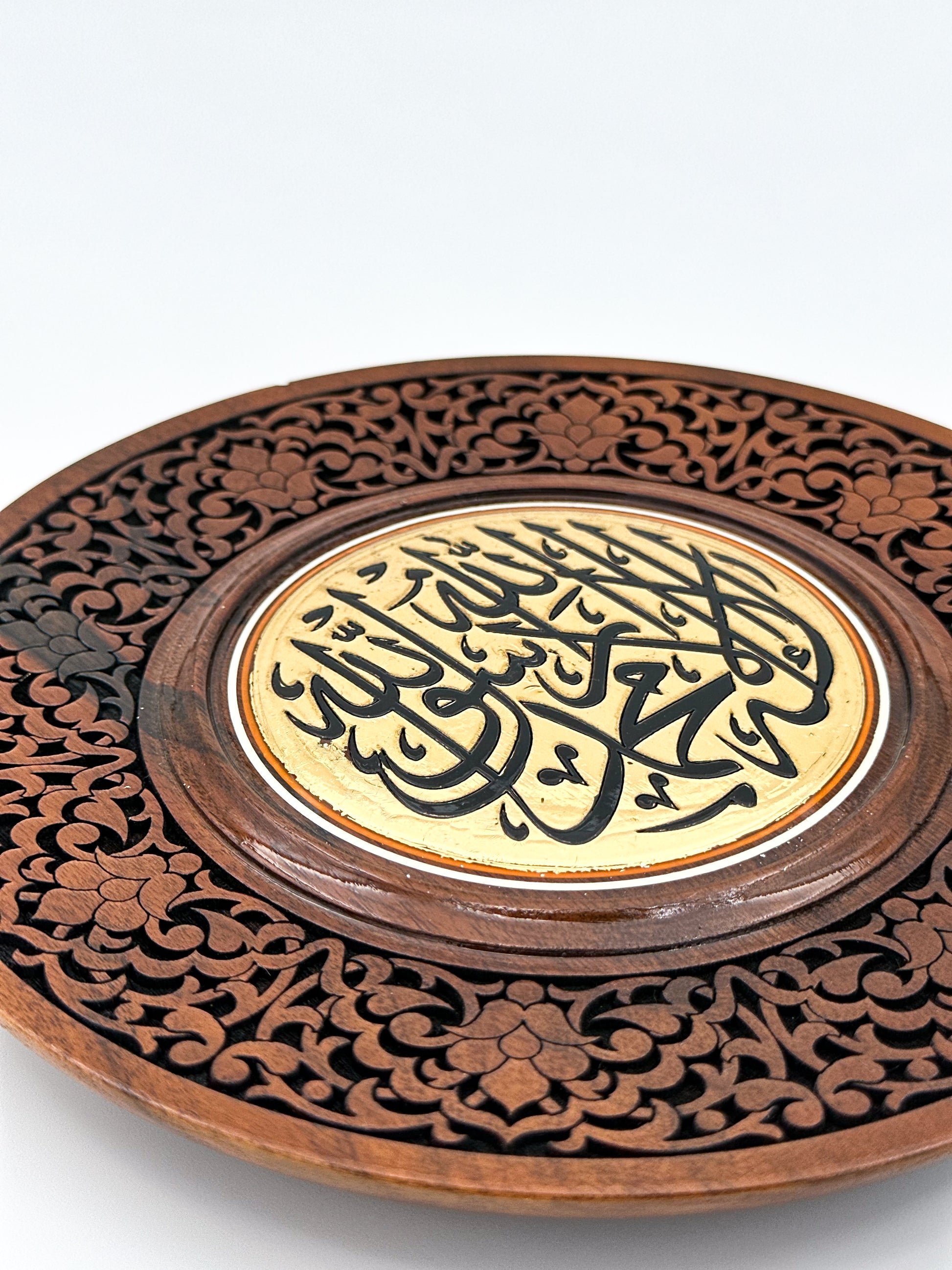 Presenting the "Shahada Carved Plate", a masterful blend of faith and artistry. This exquisite wall décor is adorned with the Shahada, the Islamic declaration of faith, beautifully inscribed in intricate Arabic calligraphy: "La ilaha illallah, Muhammadur Rasoolullah" (There is no god but Allah, and Muhammad is His Messenger).