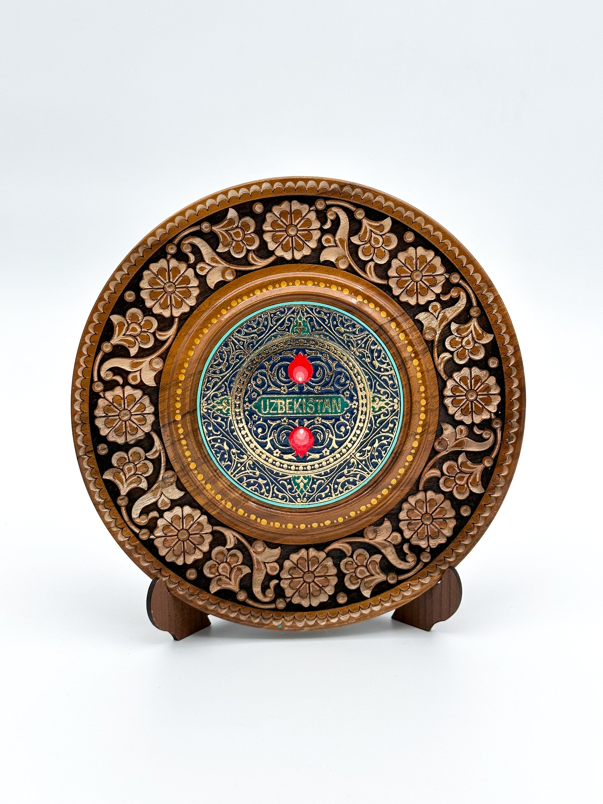 Introducing the Uzbekistan Floral Heritage Wall Plate, a masterpiece that brings the timeless elegance of traditional Uzbek craftsmanship into your home. Meticulously hand-carved with intricate floral patterns, this decorative wall plate features a stunning central medallion that proudly displays the name "Uzbekistan," surrounded by vibrant, ornate detailing. Made from high-quality materials and paired with a matching stand, this piece makes a perfect addition to your home decor or a thoughtful gift for any lover of fine art and cultural heritage. Celebrate the beauty of Uzbekistan with this extraordinary wall plate—an exquisite blend of artistry and history.