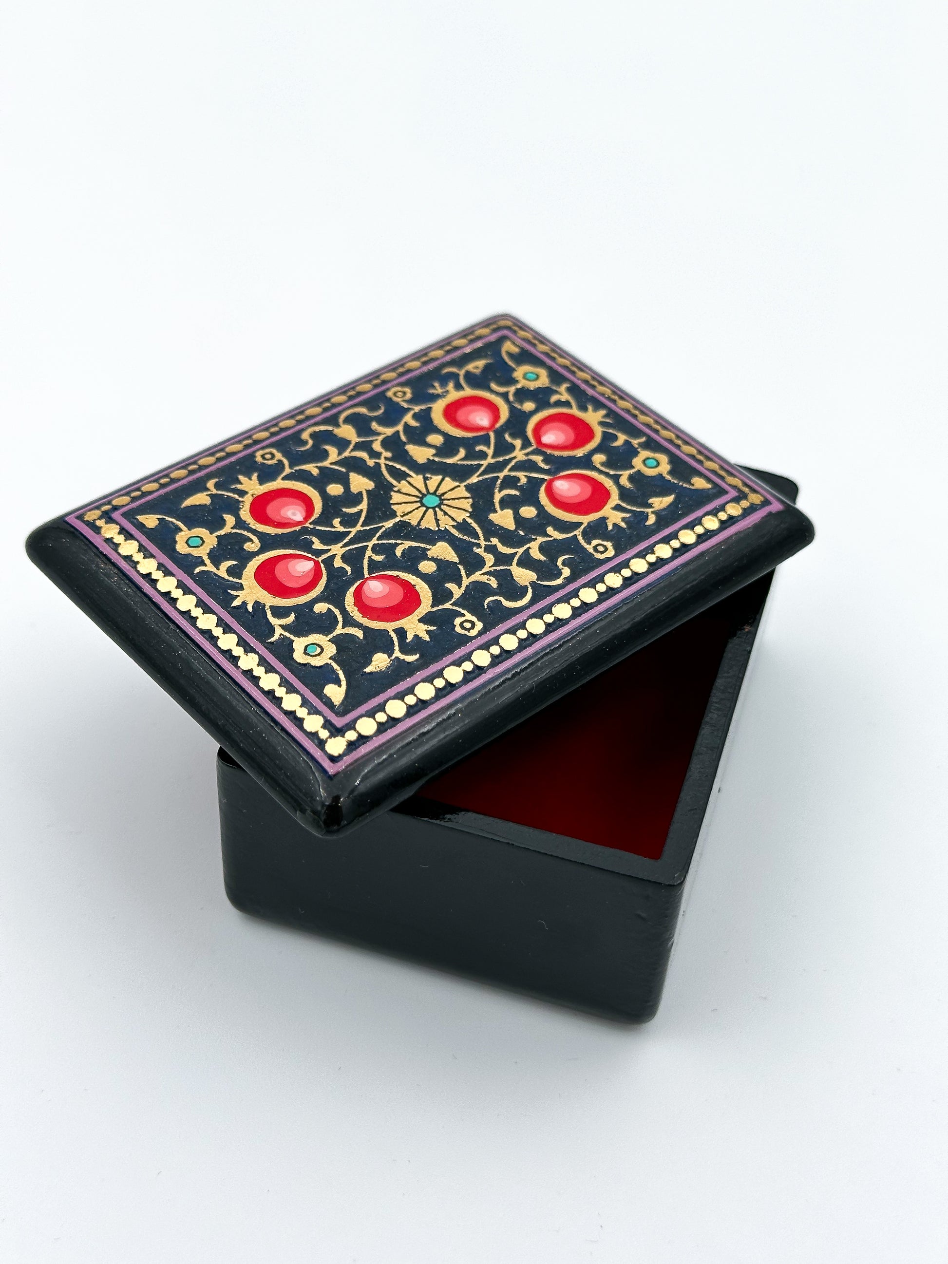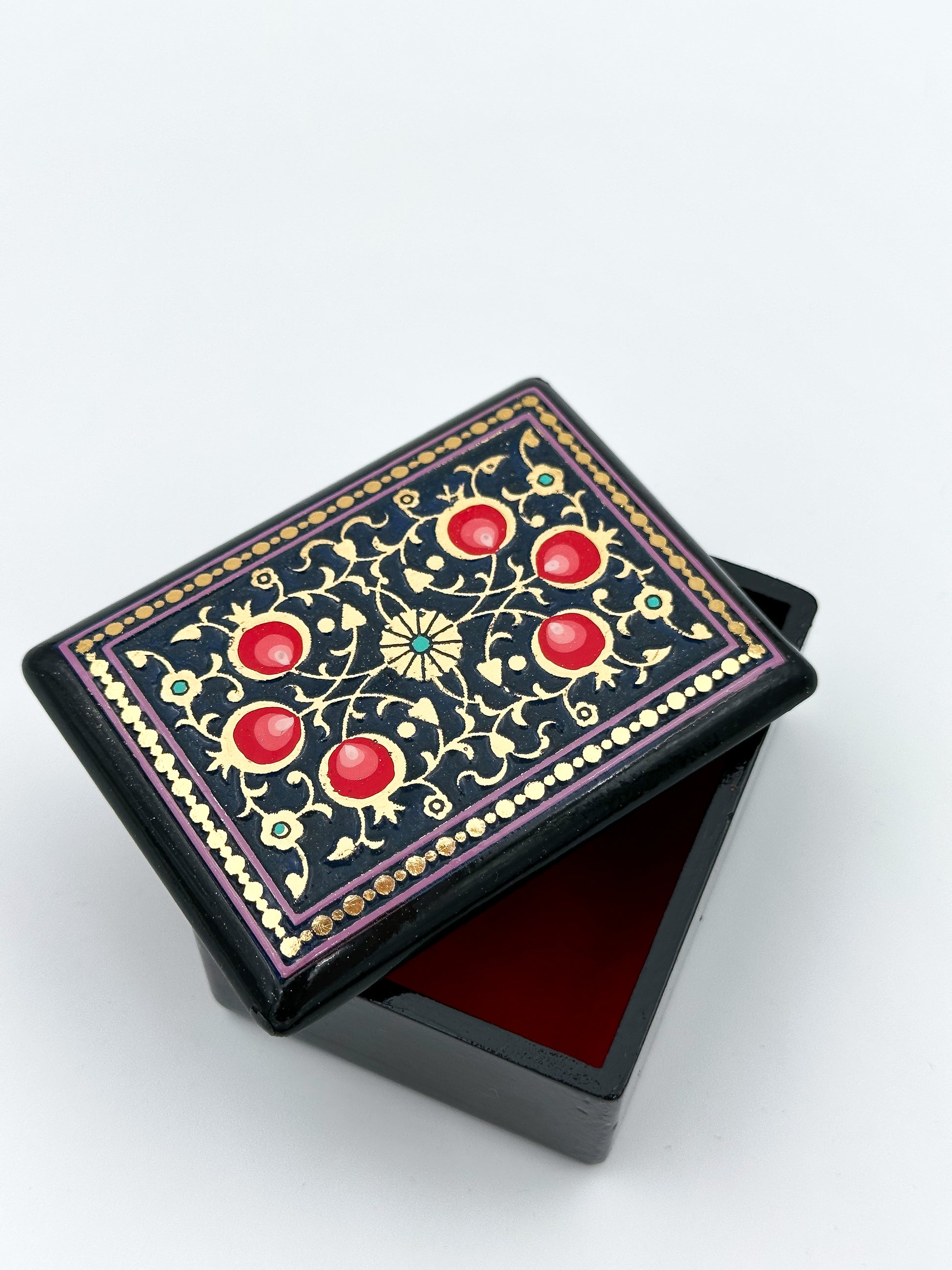 Experience the luxury and artistry of tradition with the Golden Pomegranate Treasure Box. This exquisite hand-painted box features intricate golden floral patterns intertwined with radiant red pomegranates, symbolizing abundance and prosperity. Perfectly sized to hold your most cherished keepsakes or jewelry, this piece is crafted with meticulous attention to detail, reflecting the elegance of Uzbek craftsmanship. The rich black lacquer finish provides a striking contrast to the vibrant gold and red accents, making it a stunning decorative item for any space. Add a touch of timeless beauty to your collection with this enchanting treasure box, a perfect gift for those who appreciate the art of tradition and elegance.