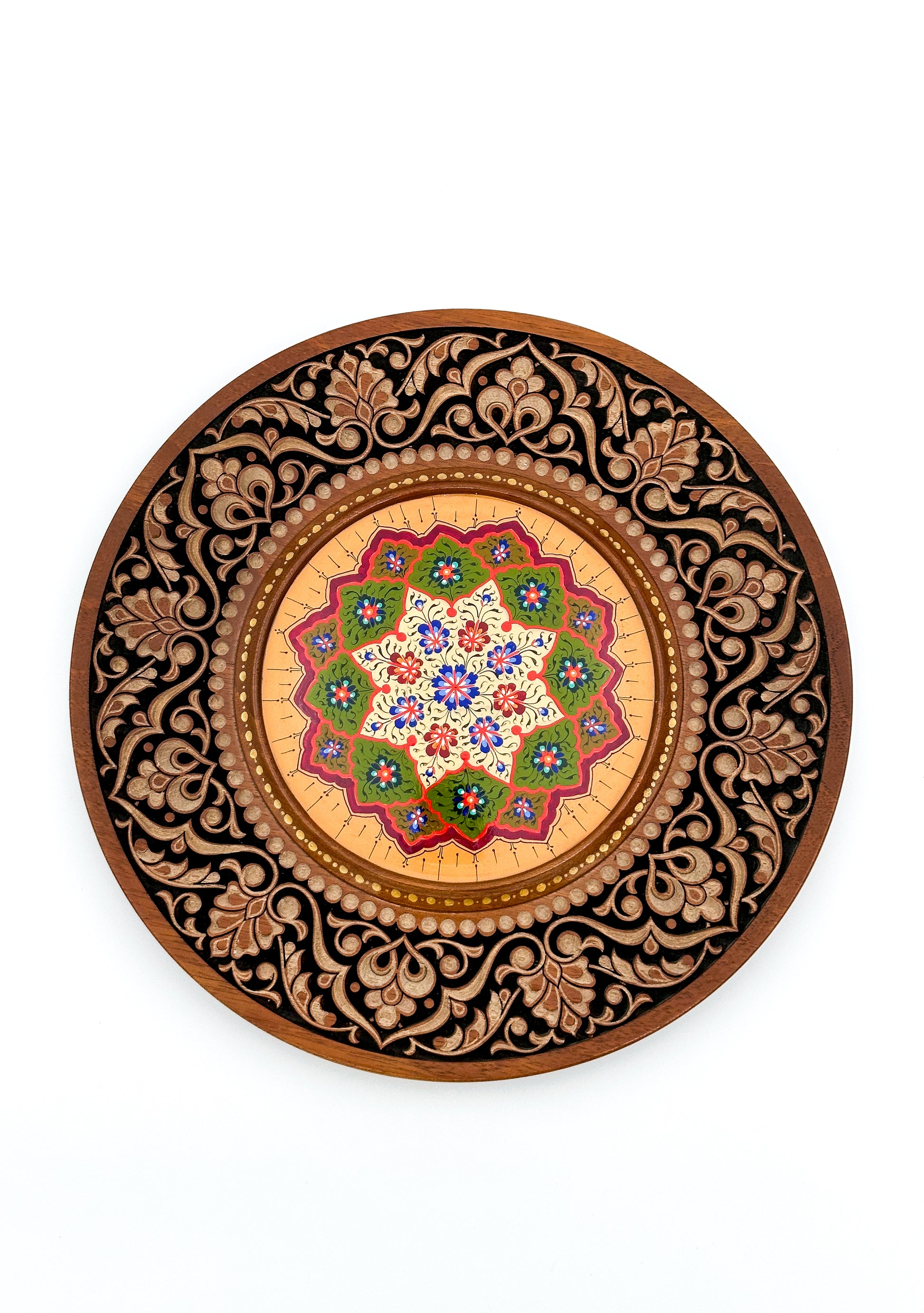 Introducing the Golden Sunburst Mandala Plate—a masterpiece of craftsmanship that brings the vibrant spirit of traditional Uzbek art into your home. Handcrafted with meticulous detail, this stunning decorative plate features an intricate mandala design, radiating with warm hues of gold, red, and green, symbolizing harmony and balance. The expertly carved floral patterns surrounding the mandala add depth and elegance, making this plate a true piece of art that reflects cultural heritage. Whether displayed on its stand or mounted on your wall, the Golden Sunburst Mandala Plate will become a striking focal point, perfect for adding a touch of sophistication to any space.