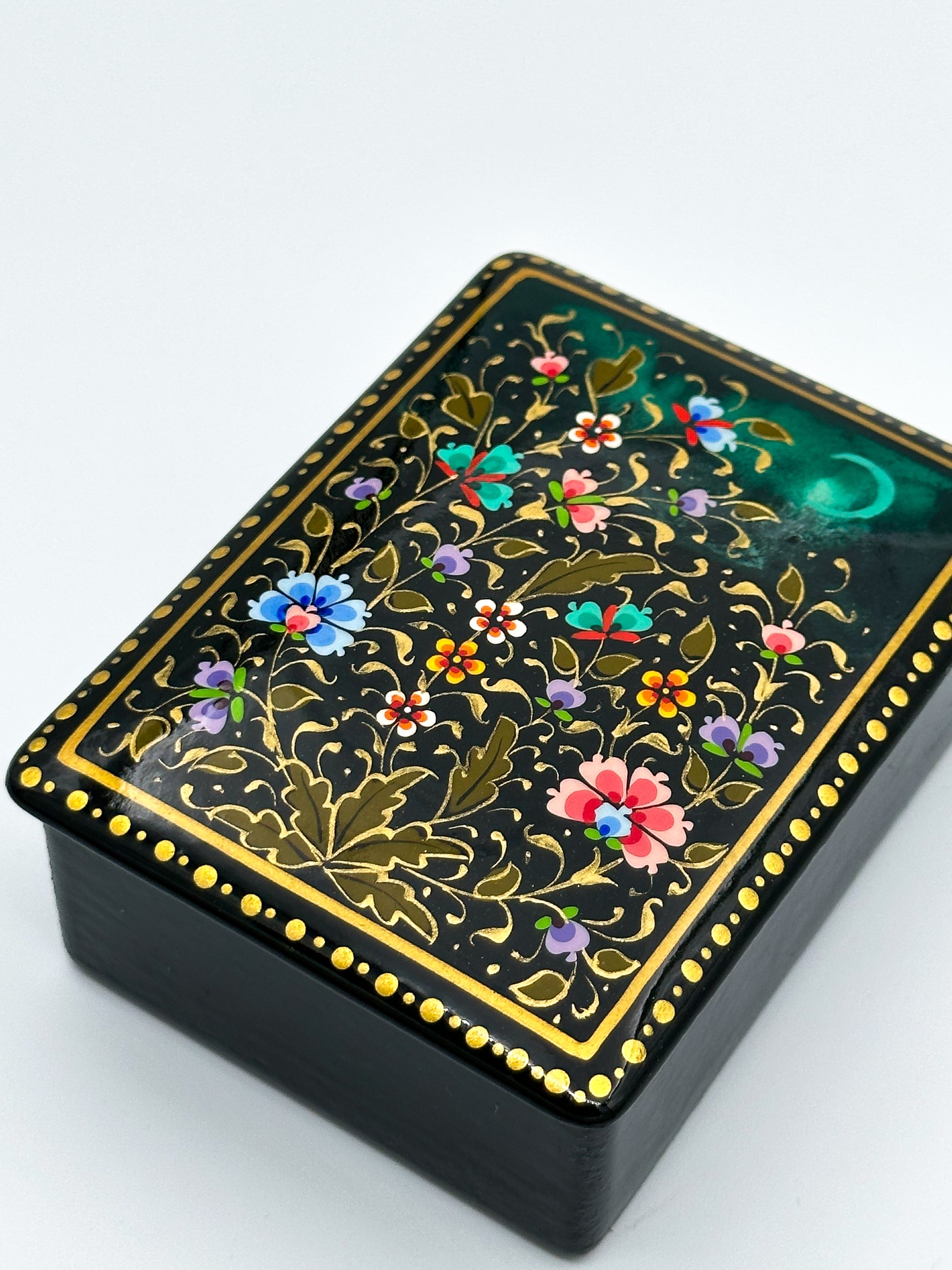 Introducing the Midnight Bloom Small Jewelry Box, where elegance meets the enchantment of a starlit garden. Handcrafted with precision, this box showcases delicate golden floral patterns set against a deep black backdrop, reminiscent of a peaceful night adorned with blossoming flowers under a crescent moon. Ideal for safeguarding your precious keepsakes, the interior boasts a luxurious red lining that adds a touch of royal sophistication. Whether as a gift or for personal use, the Midnight Bloom Small Jewelry Box is not just a storage piece, but a timeless work of art. Transform your collection into a display of beauty and grace!