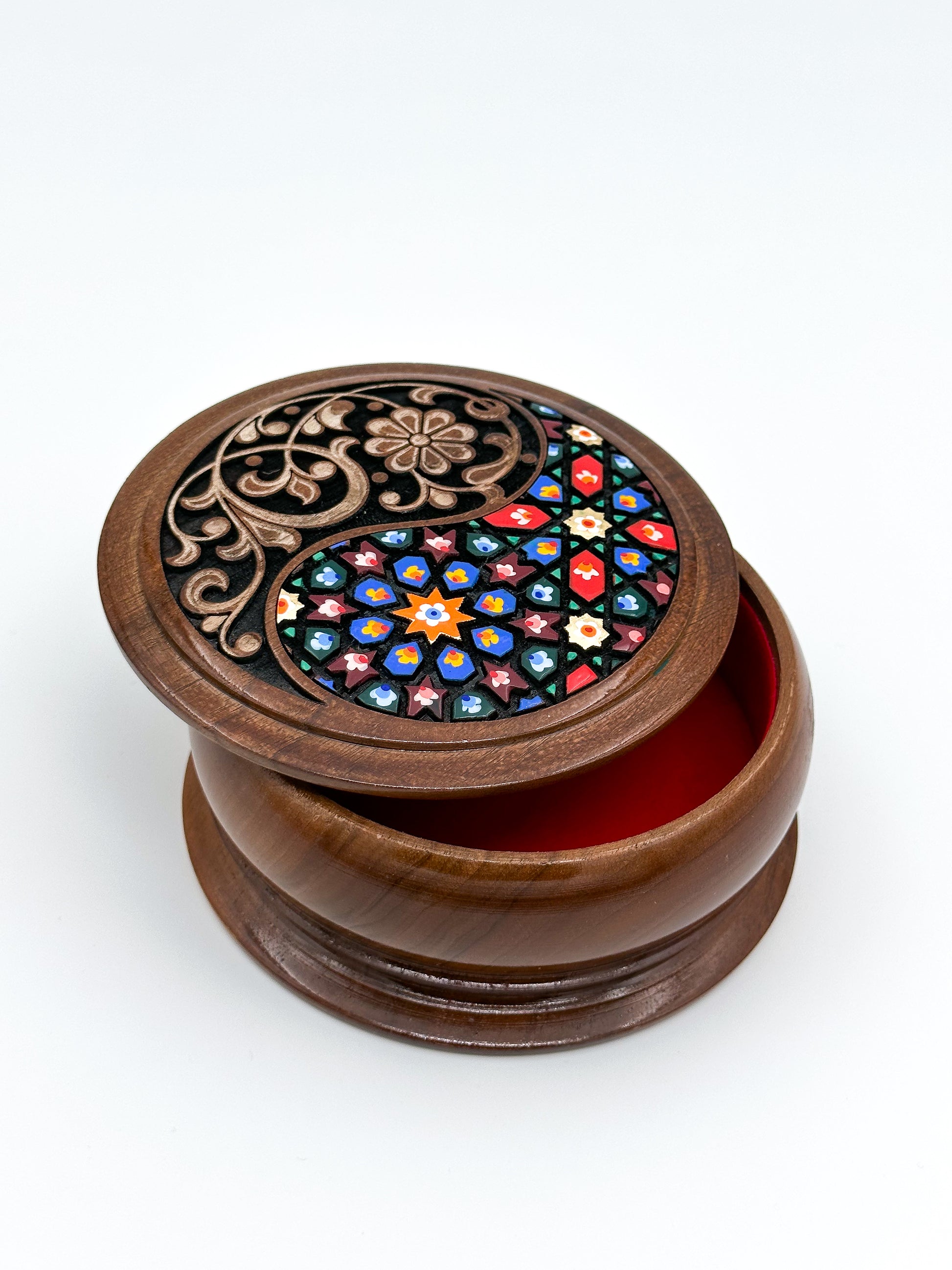 Introducing the Mosaic Harmony Keepsake Box – a stunning blend of artistry and craftsmanship. Hand-carved from rich wood, this round box features an intricate mosaic of colorful floral patterns that evoke the timeless elegance of traditional design. The smooth wooden finish contrasts beautifully with the vibrant painted details, making it the perfect home for your most cherished small treasures. Lined with a soft interior and topped with a precision-fit lid, this keepsake box not only stores your valuables but adds a touch of luxury to any space. Elevate your decor and safeguard your memories in this exquisite, handcrafted piece.