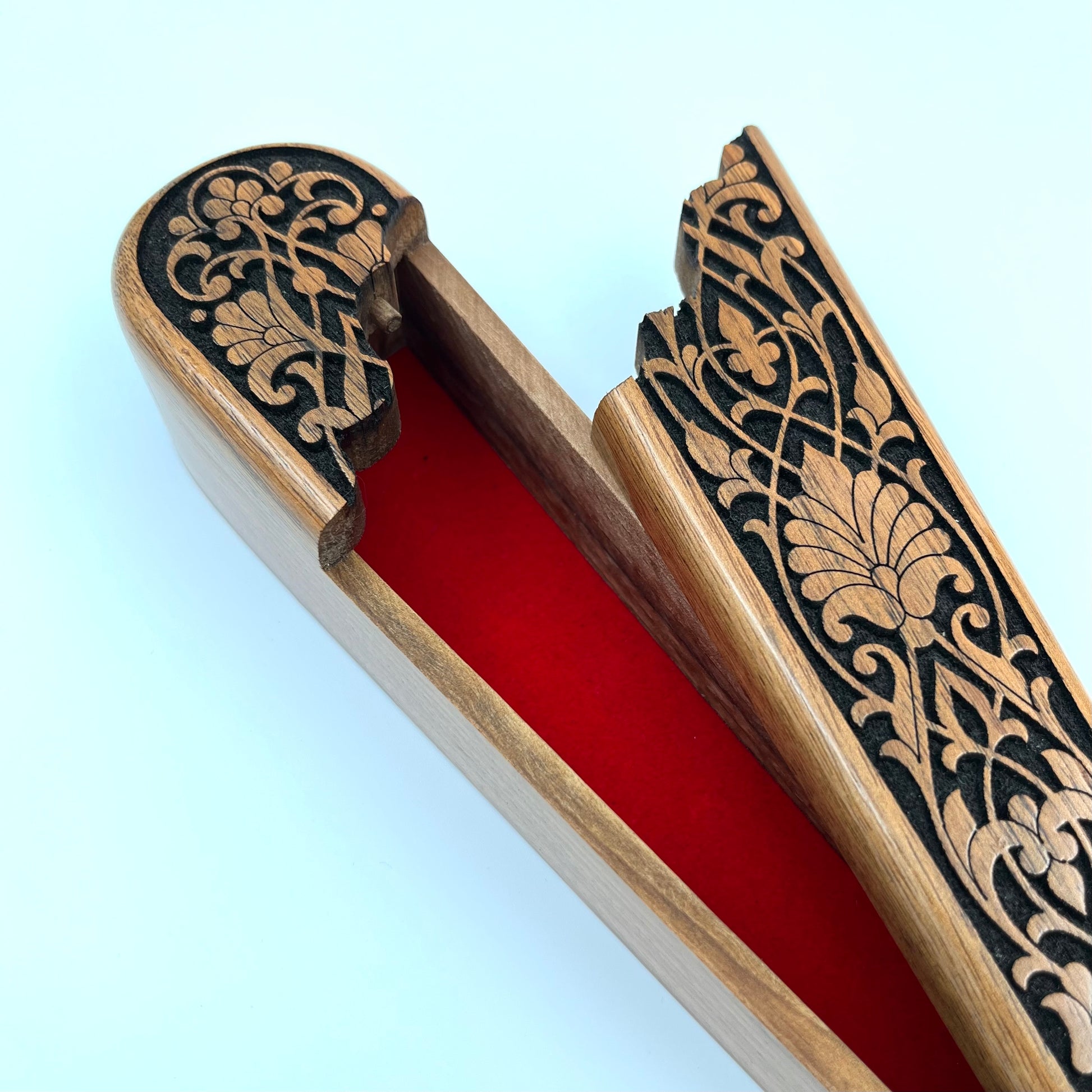 Introducing the Ornate Blossom Pen Case — a masterpiece of hand-carved artistry that brings elegance and tradition to your desk. Crafted from premium wood and adorned with intricate floral and scrollwork designs, this pen case is a celebration of timeless craftsmanship. The rich wood grain, combined with delicate carvings, creates a striking contrast that catches the eye and sparks conversation.