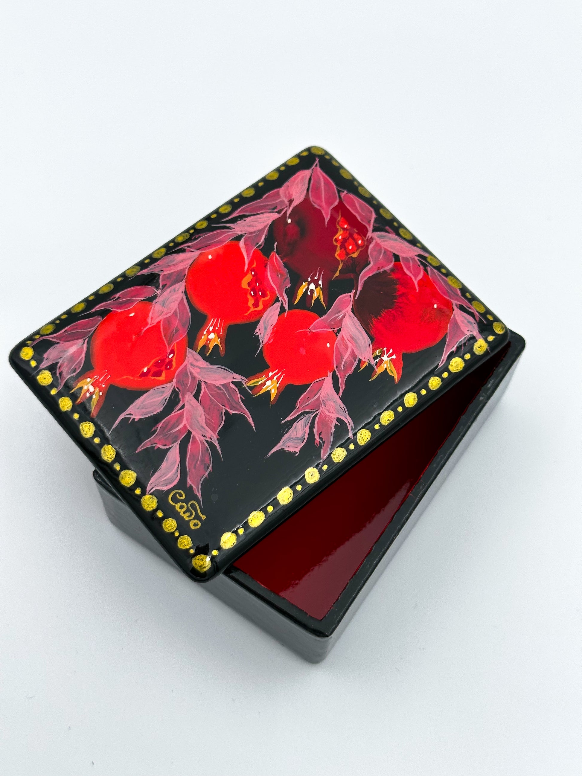 Introducing the Pomegranate Small Jewlery Box, a captivating blend of tradition and artistry. Handcrafted with precision, this exquisite lacquer box features a bold design of vibrant red pomegranates—symbolizing abundance and prosperity—against a deep black backdrop. Each detail, from the rich gold accents to the delicate brushstrokes of the leaves, reflects the essence of fine craftsmanship. Perfect for storing your precious keepsakes or as a stunning decorative piece, this box adds a touch of elegance to any space. Own a timeless work of art that celebrates nature’s beauty with the Pomegranate Small Jewlery Box!
