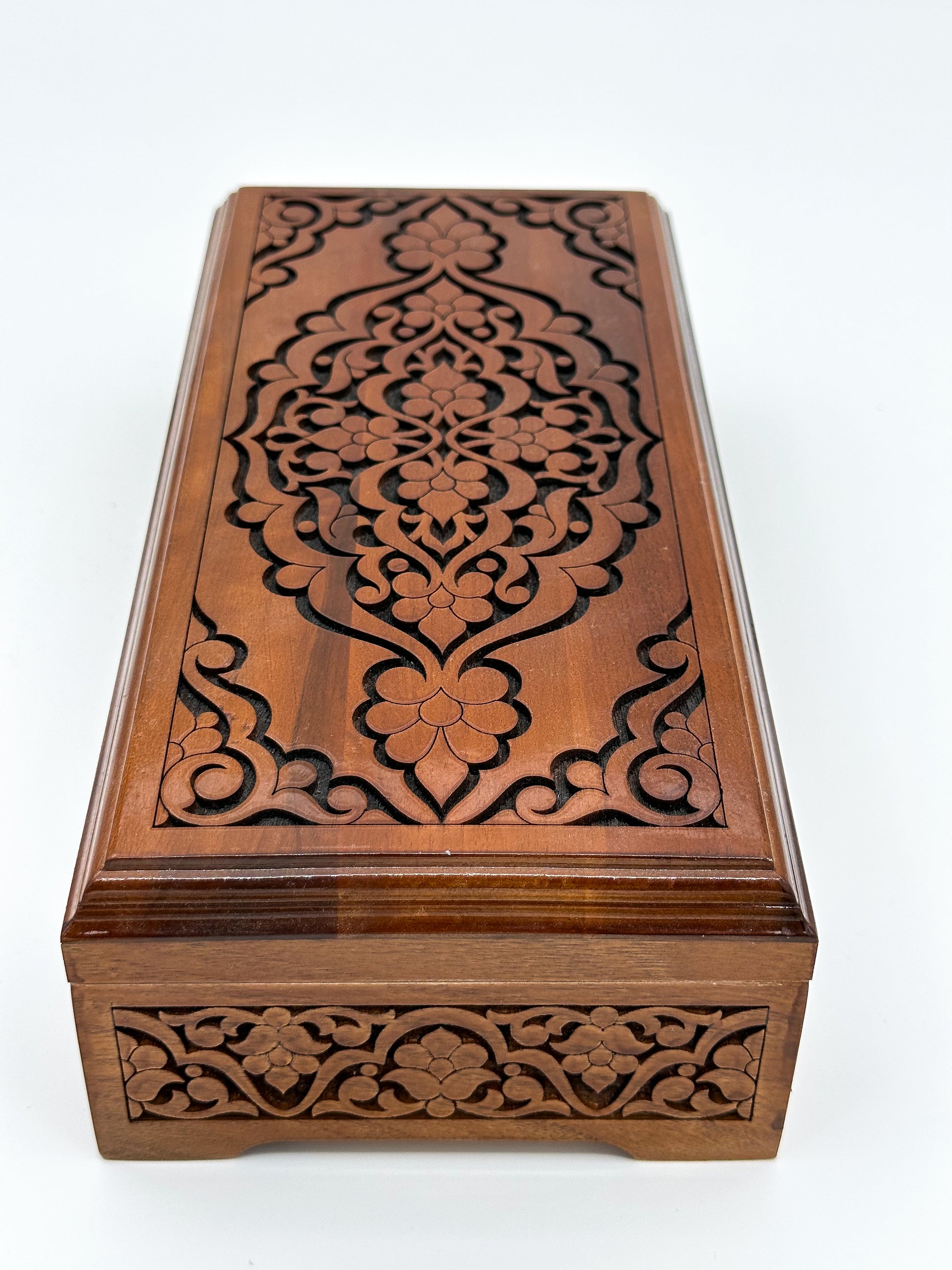 Discover the Regal Wooden Treasure Box, a masterpiece of traditional craftsmanship. Carved from premium wood, this box showcases an intricate floral motif, blending elegance and durability. The smooth red velvet interior adds a touch of luxury, perfect for storing your precious items. With its rich heritage design and modern functionality, this box is ideal for anyone looking to combine beauty and practicality. Elevate your décor or offer it as a timeless gift. The Regal Wooden Treasure Box—where tradition meets elegance.
