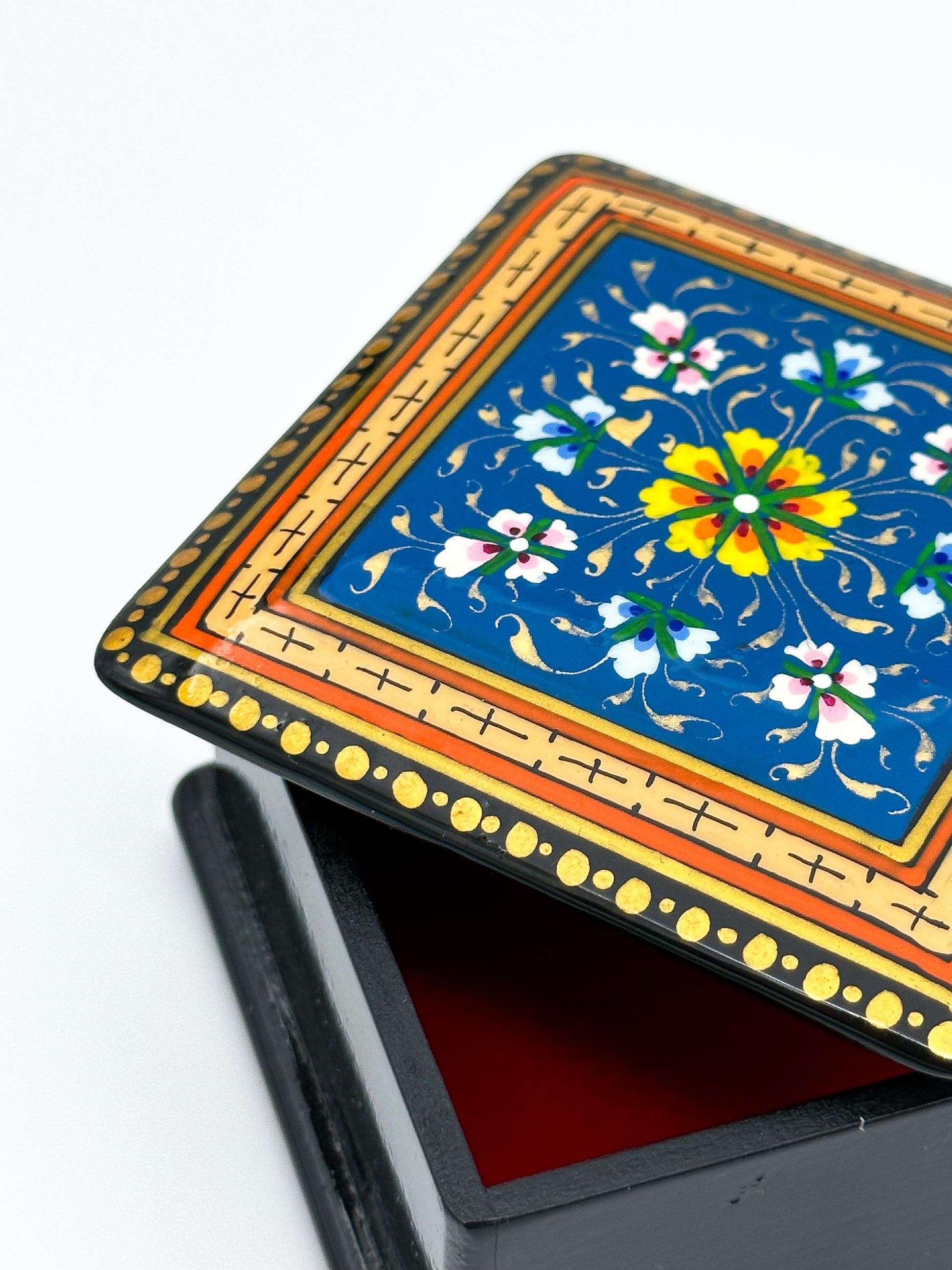 Elevate your treasures with the Royal Blossom Square Jewelry Box. Handcrafted with intricate floral details against a striking blue background, this box is both a functional and artistic masterpiece. The vibrant colors and golden accents make it the perfect place to store your precious keepsakes, while the smooth red interior adds a luxurious touch. Ideal as a gift or a personal indulgence, this jewelry box brings a touch of traditional charm to any space.