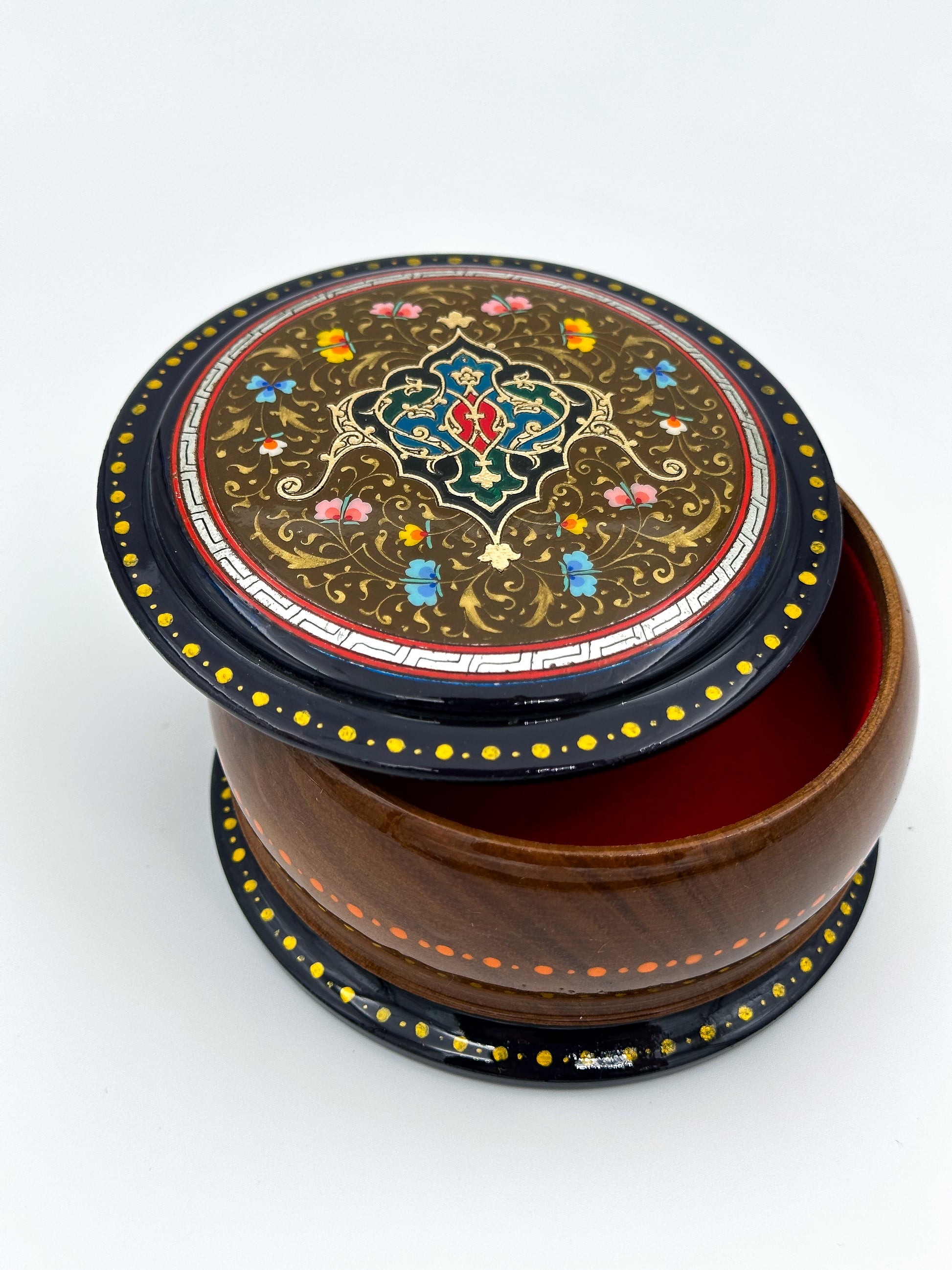 Introducing the Majestic Medallion Keepsake Box – where timeless elegance meets meticulous craftsmanship. Handcrafted from premium wood, this round box features an exquisite medallion design on its lid, adorned with delicate floral patterns and intricate gold detailing. The rich color palette of deep reds, greens, and blues highlights its royal elegance, making it a perfect accessory to store your cherished treasures. Lined with a soft red velvet interior, it offers both protection and beauty for your precious items. Elevate your home décor or gift someone special with this one-of-a-kind keepsake box, a true masterpiece of artistry.