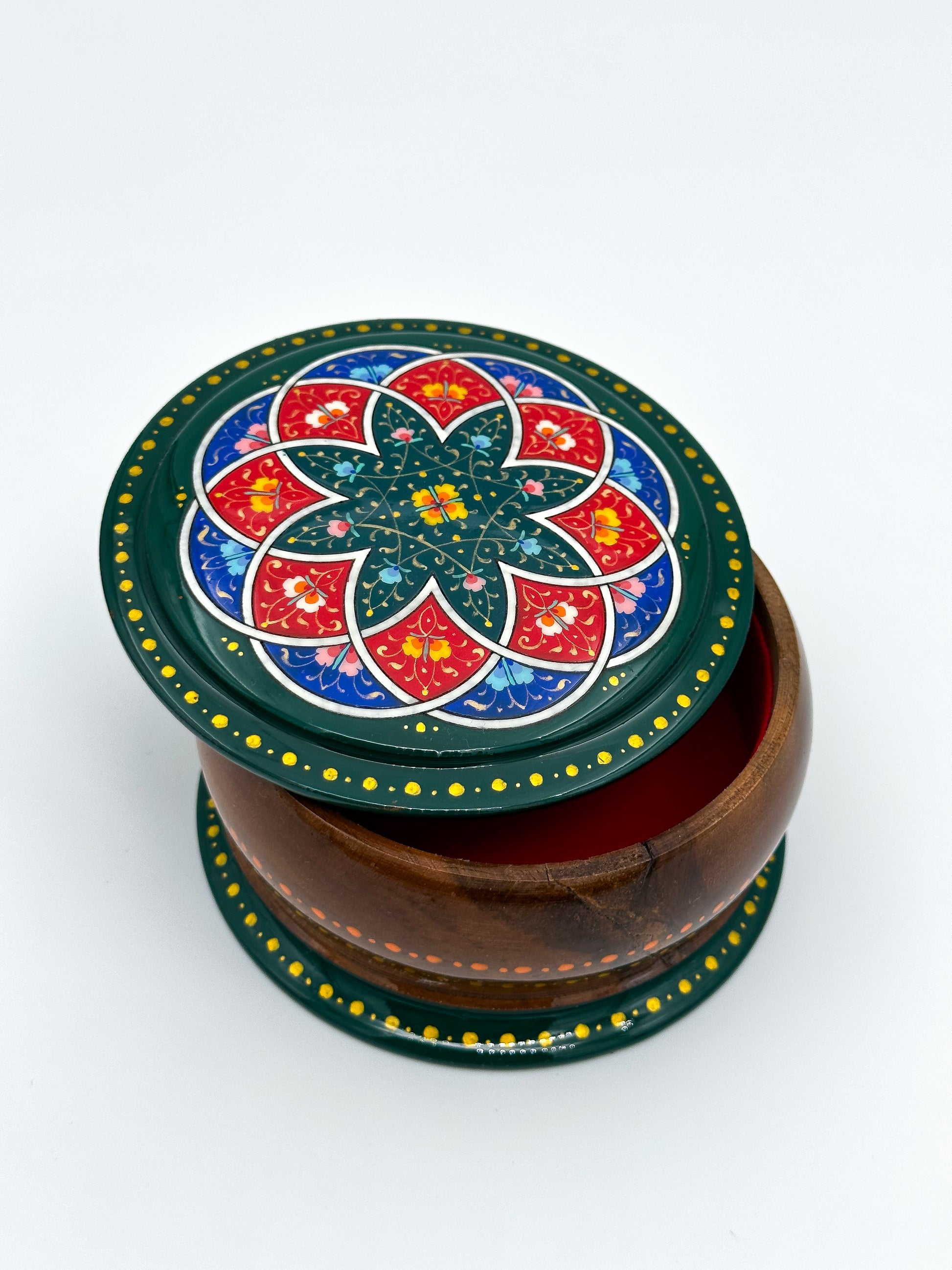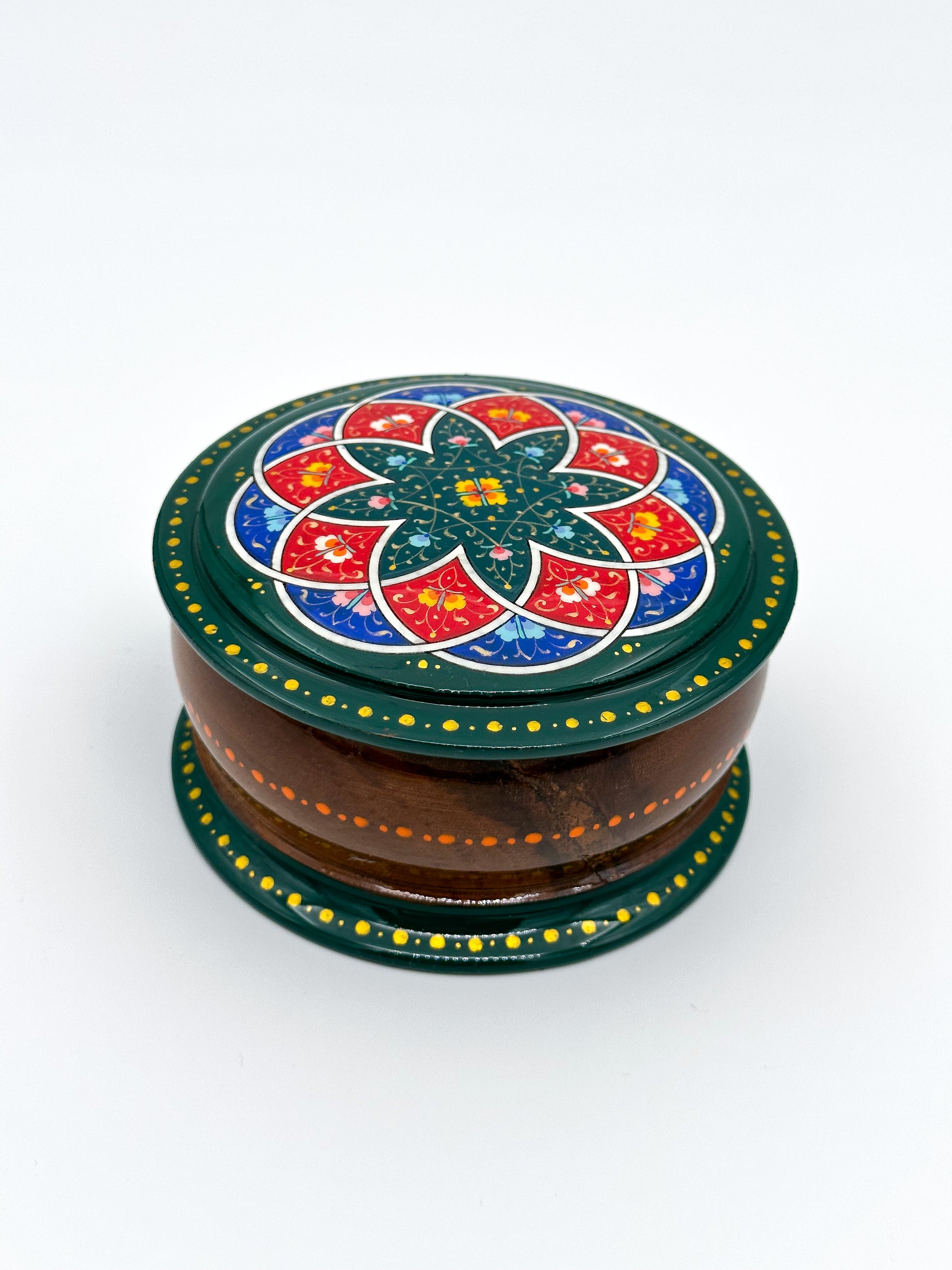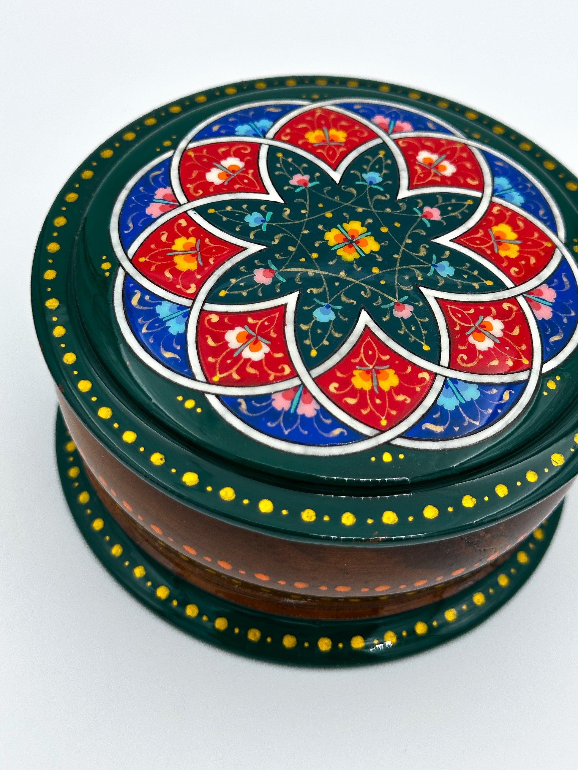 Introducing the Radiant Mandala Keepsake Box, where timeless elegance meets intricate craftsmanship. Adorned with a vibrant hand-painted mandala design in rich hues of red, blue, and green, this wooden box is perfect for storing your cherished items. Its circular form and smooth finish evoke a sense of harmony and tradition, making it a standout piece for any collection. Whether for jewelry, trinkets, or as a unique decorative accent, this keepsake box beautifully combines artistry and function, capturing the essence of tradition and modern design. A perfect gift for someone special or a treasure to keep for yourself!