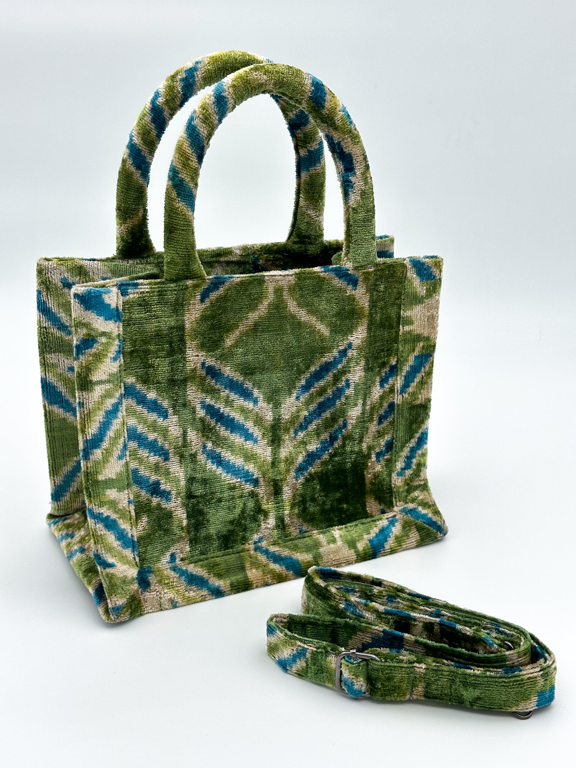 Celebrate the rich cultural heritage of Uzbekistan with this exclusive collection of velvet bags, each crafted with intricate Ikat designs. Combining traditional craftsmanship with modern style, these bags offer vibrant colors and luxurious textures perfect for both casual and special occasions. Each piece is accompanied by an adjustable strap, ensuring both style and versatility for any outing.